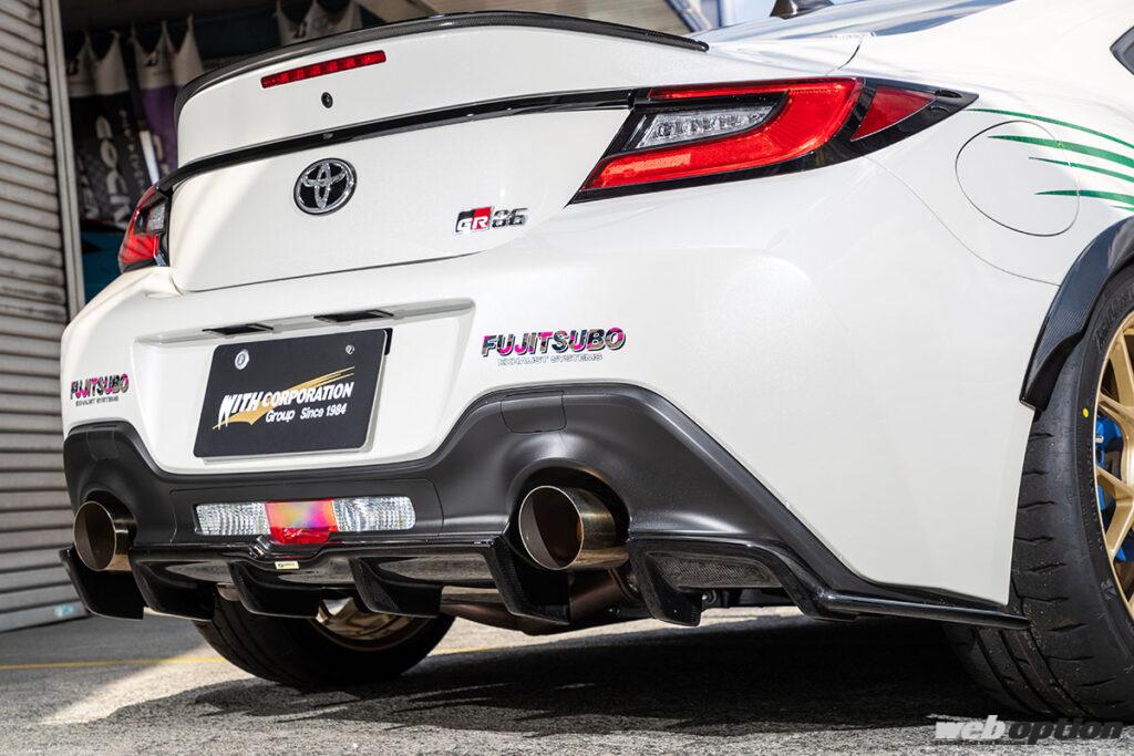 リヤセクションは車体下面に入り込んだ空気を効果的に排出するディフューザー(FRP:5万5000円/カーボン:10万7800円)を採用してバックビューを引き締める。社外マフラーに対応しており、中央部と左右の3ピース構成となっている。