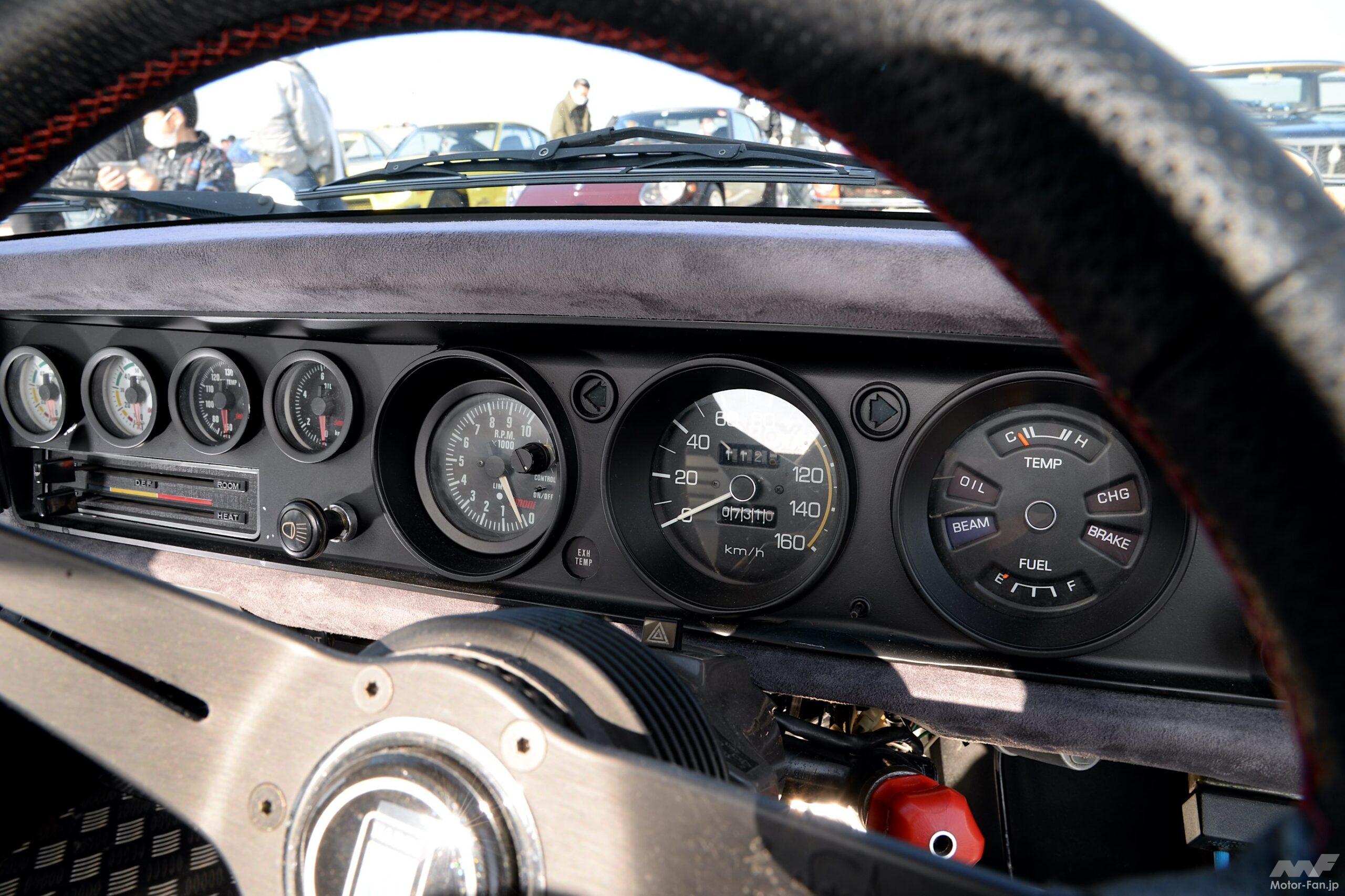 またパネルも全面的に刷新されていて純正だと空調スイッチ付近で分割されているところ、1枚のパネルで作り直してある。純正にはない4連メーターを追加するとともに、タコメーターを社外品へ変更してあるのだ。