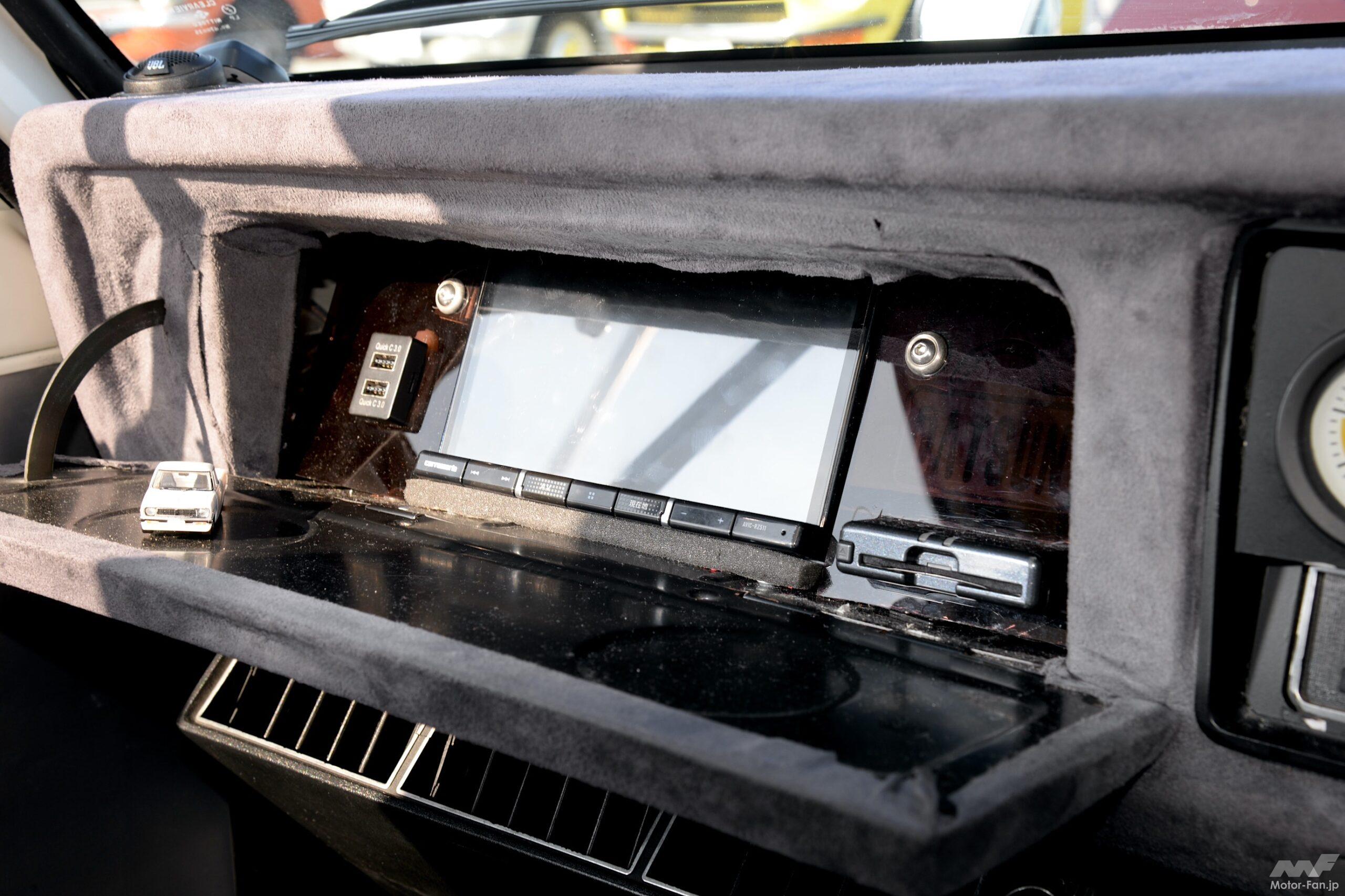 旧車のようなスタイルを大事にするなら、ナビやETCユニットは見えない場所へ設置したいもの。でも中身は1990年式のモデルなのだから、便利な装備は盛り込みたい。そんな悩ましい葛藤への良い解決策になっているのではないだろうか。高年式のクルマをカスタムするなら、お手本にしたい例といえる。