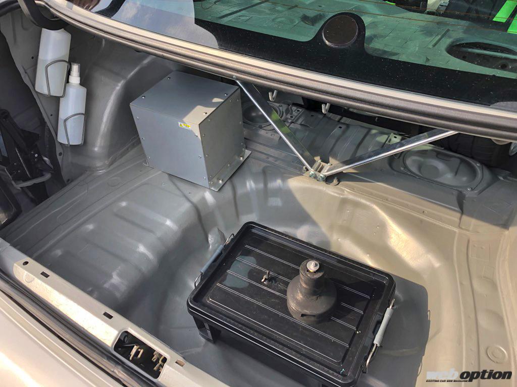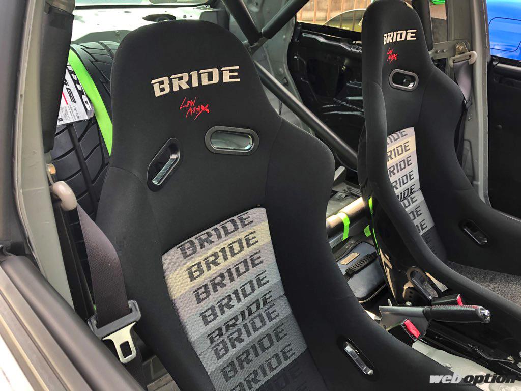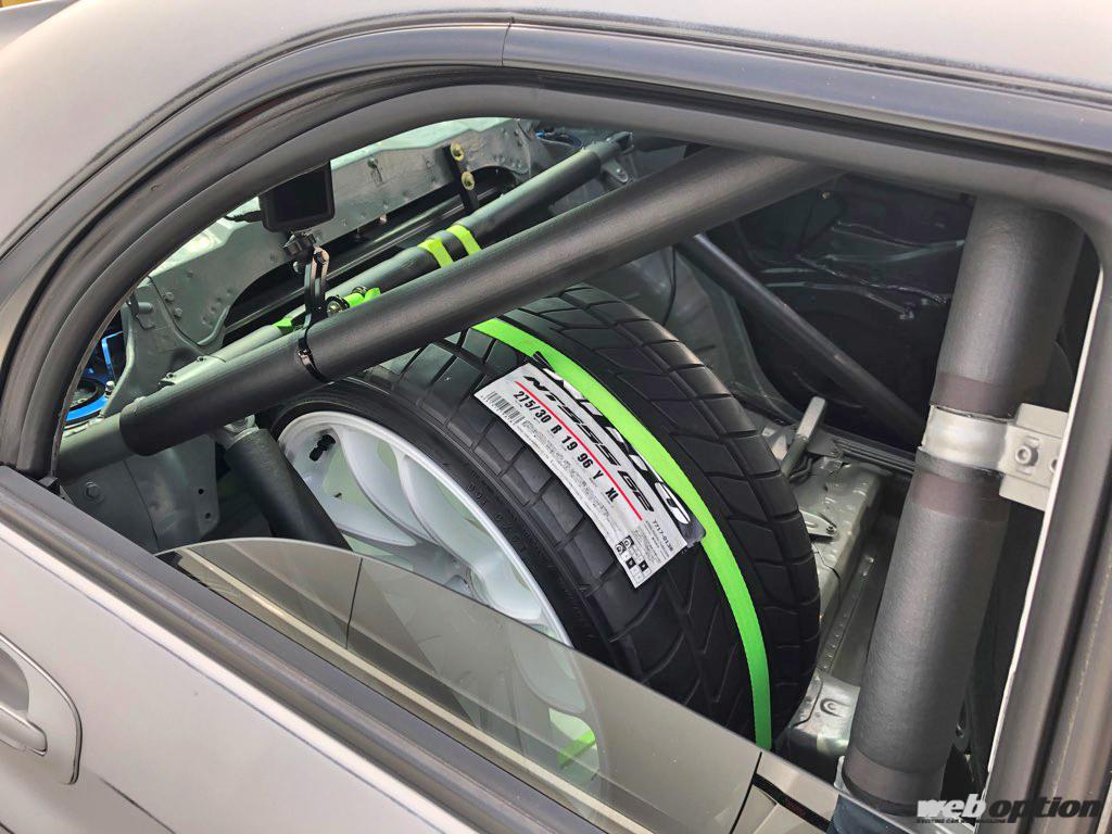 リヤシートは完全撤去し、空いたスペースをタイヤラックとして活用する。もちろん、2名乗車公認仕様だ。