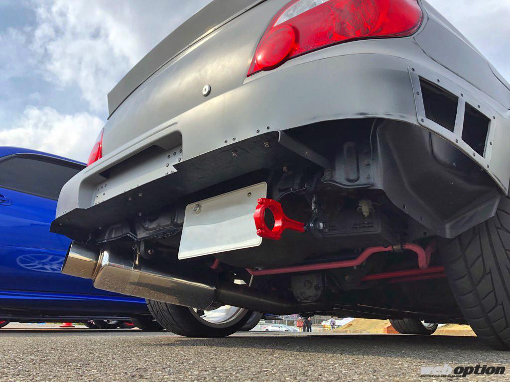 リヤセクションもインパクト抜群だ。バンパーは純正を大胆にカット加工して、フレームにナンバーを直付け。ロケバニ風のリヤウイングはWADAさんの自作。なお、バンパーやフェンダーなど下部をカットしたこの仕様で、きっちりと公認車検を取得していたりする。検査官にコンロッドの牽引フックがバカ受けしたそう。存在感を主張するエキゾーストマフラーは、フジツボのパワーゲッター改だ。