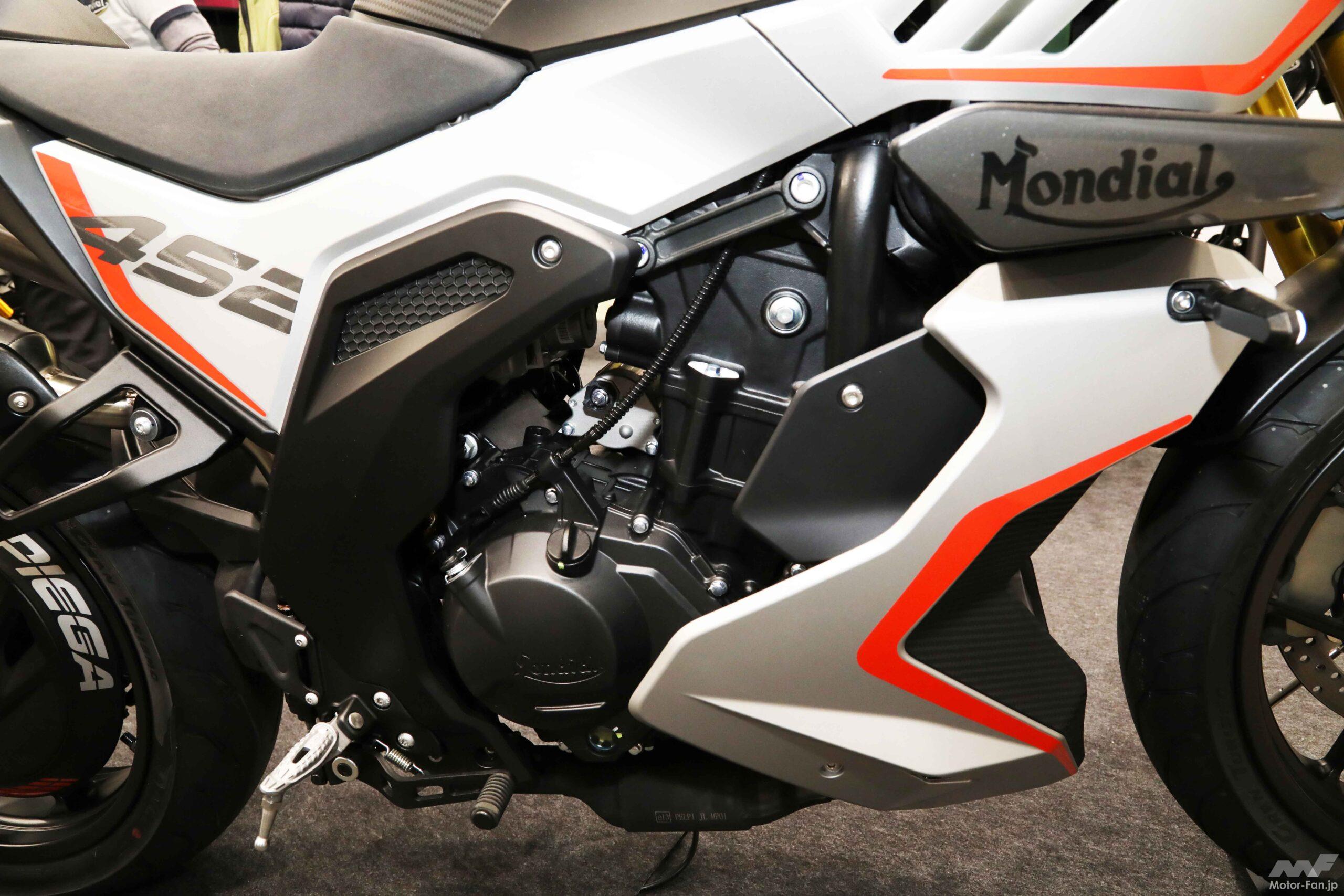 ストリートファイター風のスタイルが特徴的な「PIEGA452」は、2002年にホンダ製V型2気筒999ccユニットを搭載したPIEGA1000というスーパースポーツモデルが発売されていたが、そのPIEGAの名を受け継いだモデル。現在125ccモデルも販売されているが、PIEGA452はフレームも異なり、エンジンはパラレルツインのDOHC8バルブ、449.5ccユニットを搭載。ヨーロッパのA4ライセンス(排気量制限はないが出力は35W以下)に対応して、出力は35kW(47.6ps)に抑えられている。車両重量176kgの軽量で、1398mmというショートホイールベースのおかげで軽快なハンドリングが楽しめる。フロントブレーキにはブレンボ製のラジアルポンプマスターシリンダーとキャリパーを採用している。