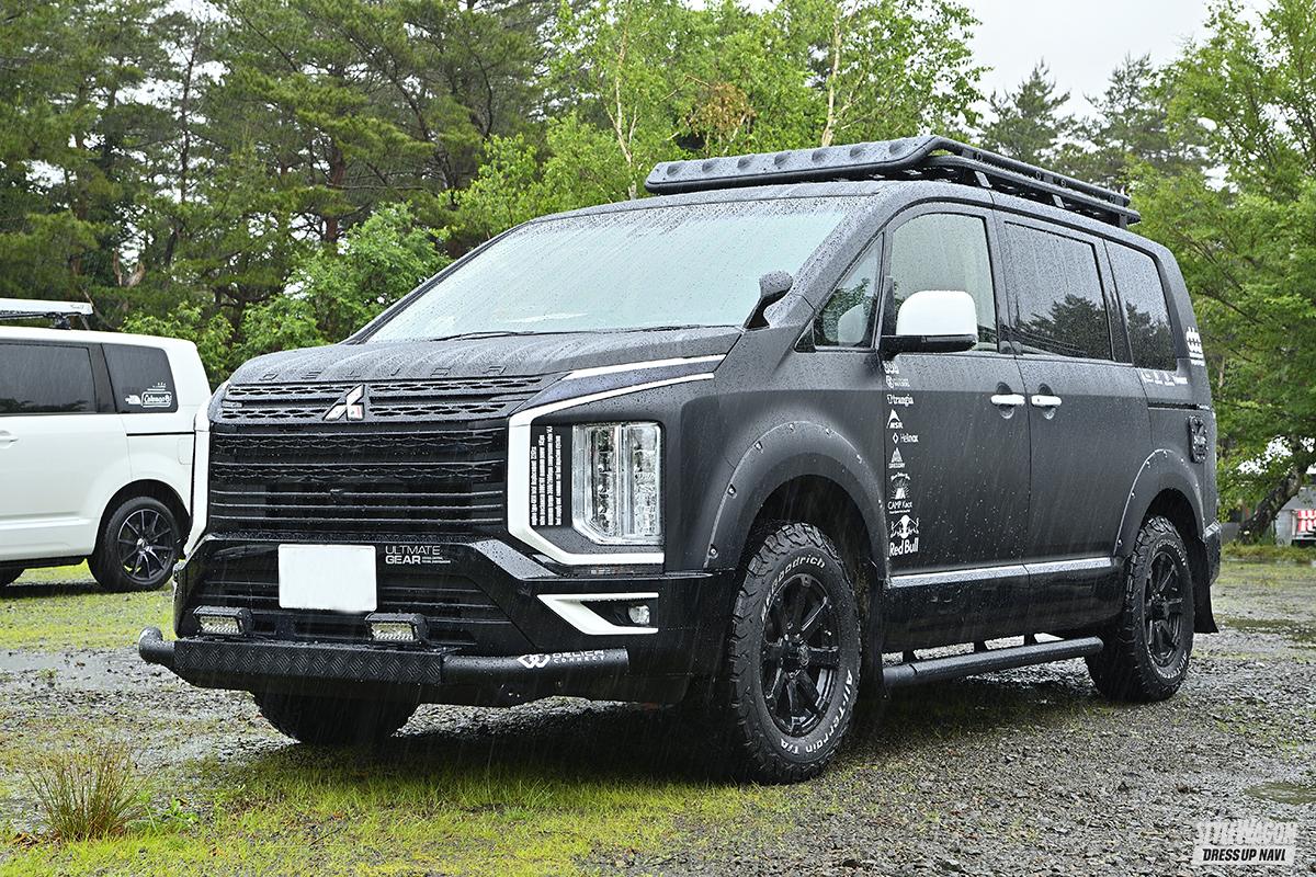 謎のデリカマスクマンとして登場したmatte_d5さん。なぜマスクマンなのかというと、愛車デリカのフェイスマスクをイメージして「マスクは本物仕様で5万円ほどで作りました」から。ちなみにアイライン、ヘッドライトガーニッシュを三菱のスコーティアホワイトにペイントし、歌舞伎の隈取りのようなフェイスを演出する「DKB(デリカカブキブラザーズ)」の2号機として知られる1台なのだ。3年ほど前に、10年24万km乗った前期から乗り換え。マットペイント&ホイールの状態で購入。その後ボンネット、グリルなどDIYでラプターライナー塗装を施す。さらにフロントのマドリス製フロントガードにもフォグランプをDIYで取り付けた。「もうほぼほぼ完成。あとはステッカーの貼り替えとか極力シンプルに!」。