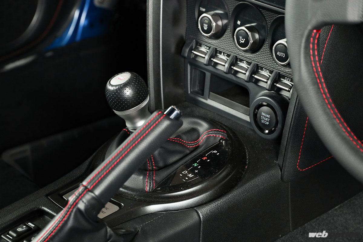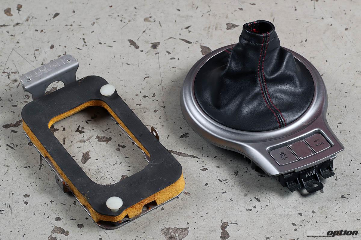 室内でも、MT車とAT車ではシフトパネル形状が異なる。BRZの場合はもちろん純正パーツの流用で問題なし。これがATしか存在しないモデルだと、シフトゲート周辺パネルを作る手間が発生する。