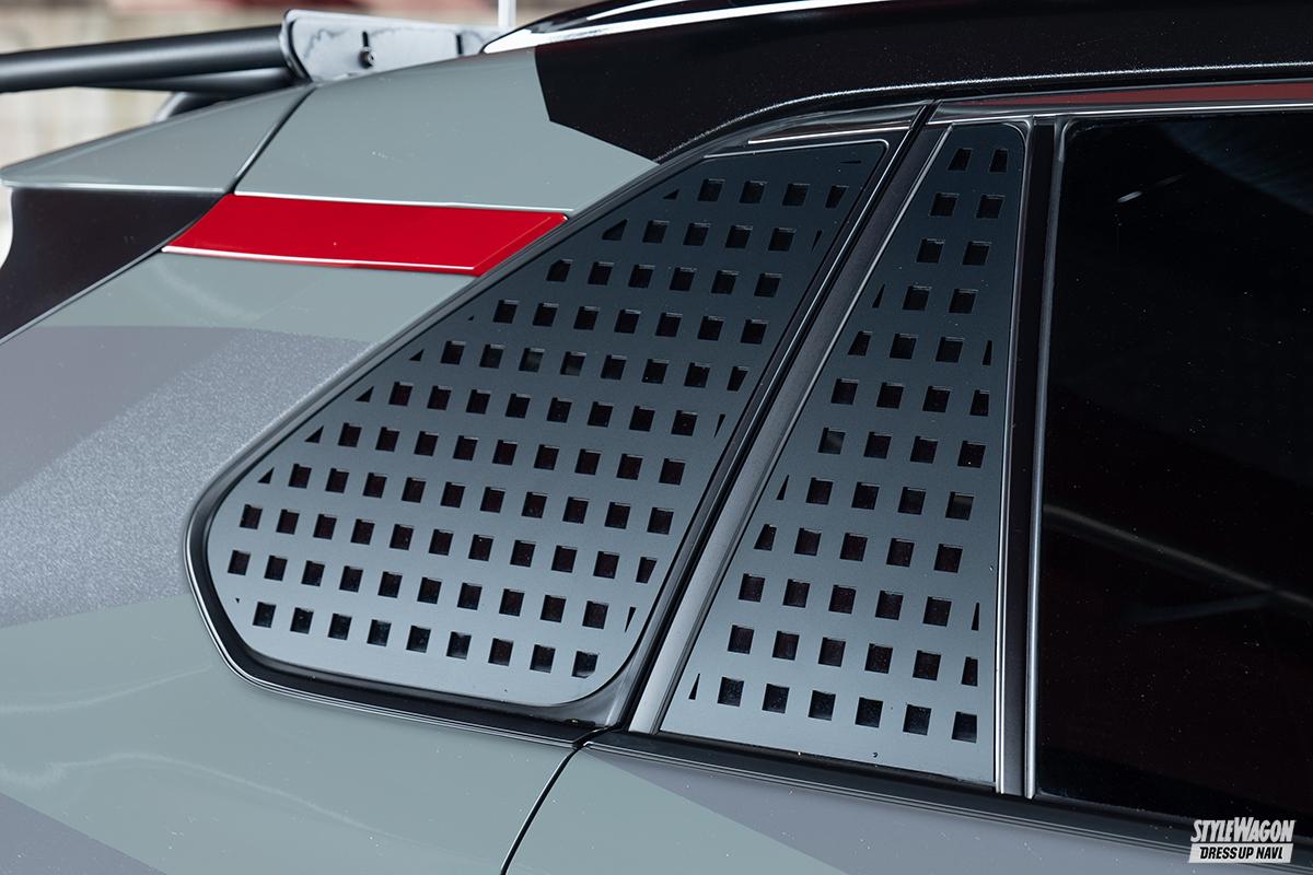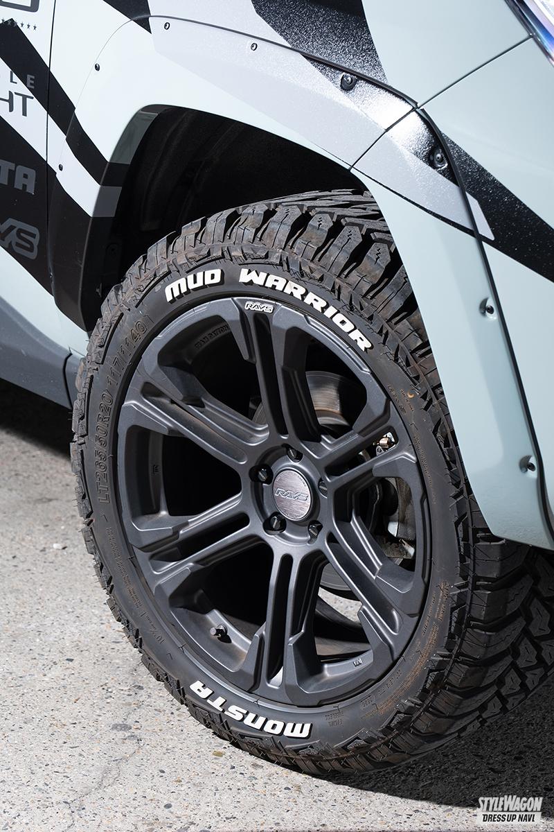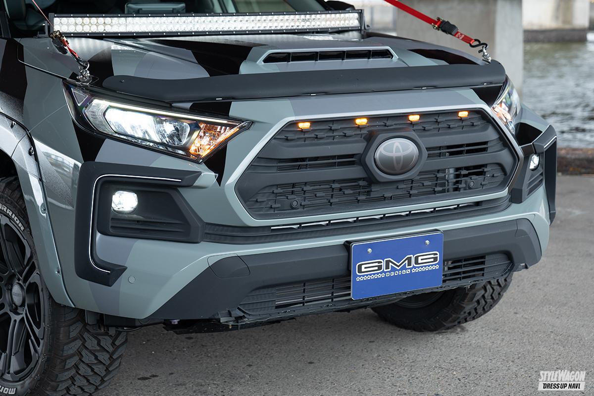 例えば、写真のRAV4。ハウスブランドであるダブルエイトのオバフェンやボンネットカバー、フォグカバーとGMGオリジナルのスモークフィルムなどを投入し、ネクサスジャパン製スチールパーツ、迷彩ラッピングによってイマドキ感たっぷりのカスタムが施された1台となっている。