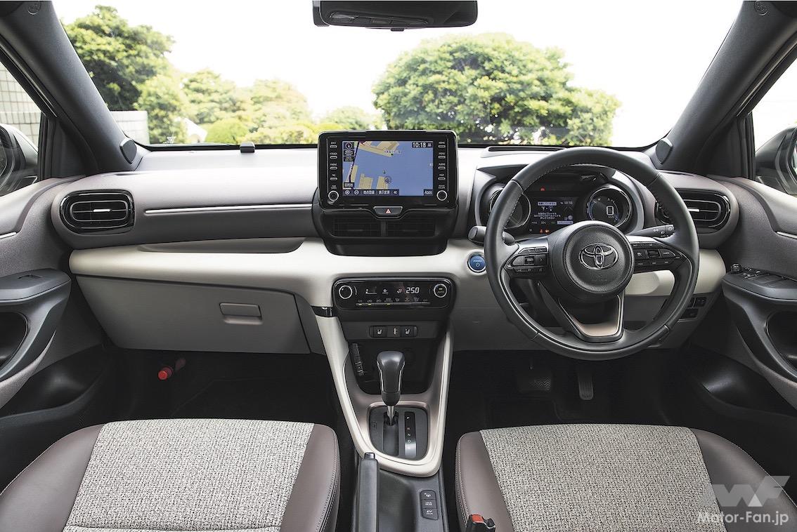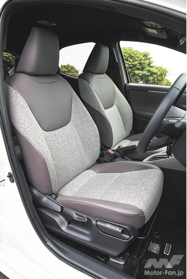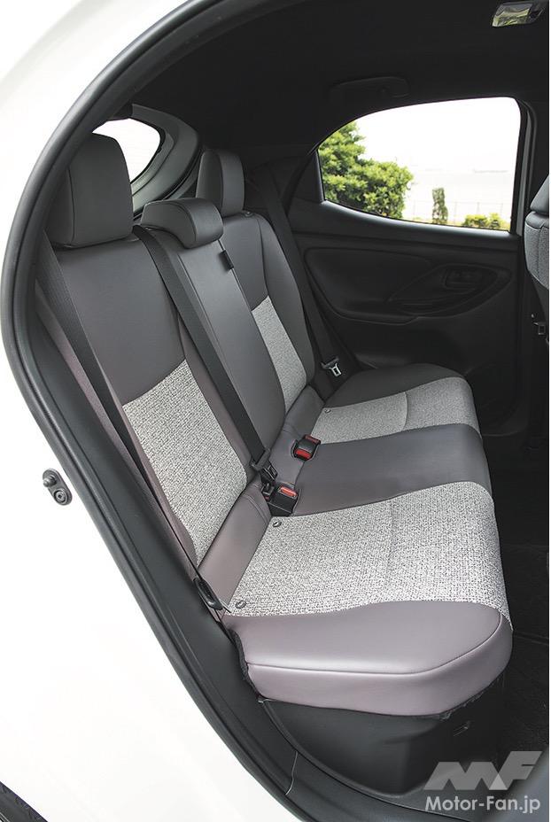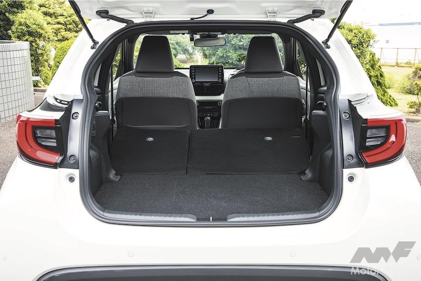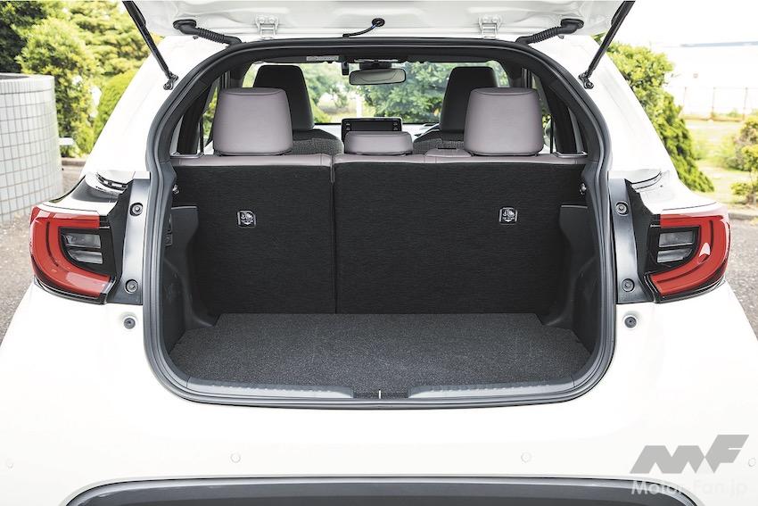 後席は足元空間が狭めだ。身長170cmの大人4名が乗車して、後席に座る乗員の膝先空間は握りコブシひとつ少々に留まる。ルーフを後方に下降させてリヤゲートを寝かせたから、着座位置も下がり、腰が落ち込みやすい。後席の居住性を重視するなら、同じプラットフォームを使うアクアが快適だ。