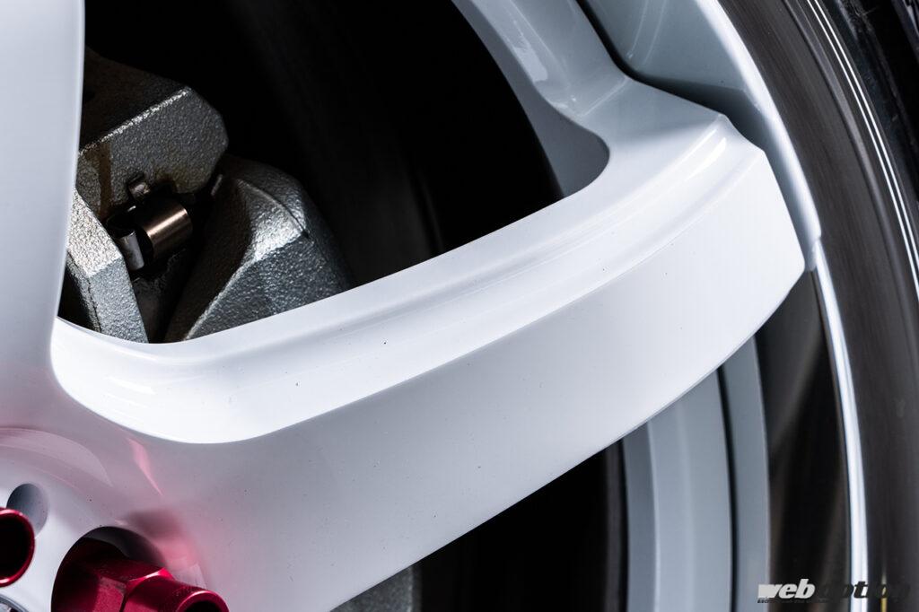 取材車両は、ホワイトディスクとバフアルマイトのリムを組み合わせて、清潔感のあるスポーティさを演出。TRDのエアロパーツに引かれた赤ラインとシンクロさせた、レーシングナット&センターキャップのアクセント効果も秀逸だ。