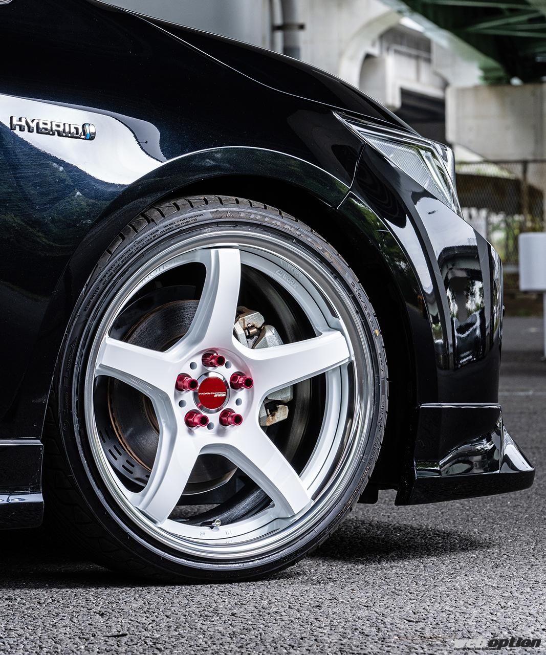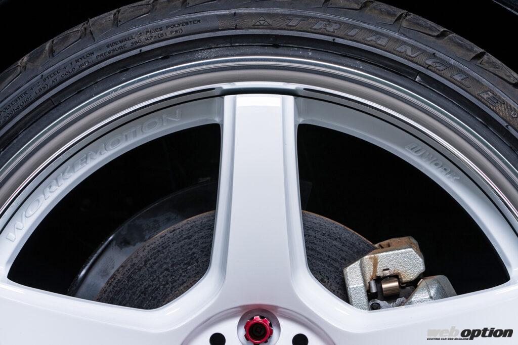 取材車両は、ホワイトディスクとバフアルマイトのリムを組み合わせて、清潔感のあるスポーティさを演出。TRDのエアロパーツに引かれた赤ラインとシンクロさせた、レーシングナット&センターキャップのアクセント効果も秀逸だ。