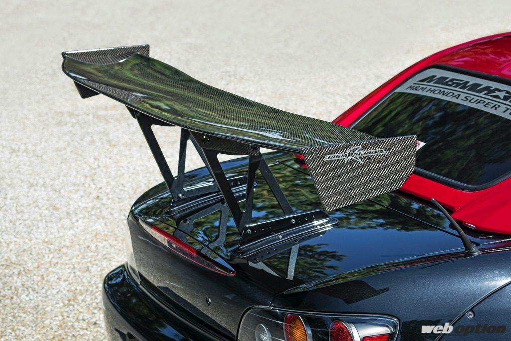 カーボンリヤウイング(15万7000円〜)は空力性能だけでなく、ルックスからも人気が高いアイテム。その美しい仕上がりはさすがM&Mだ。