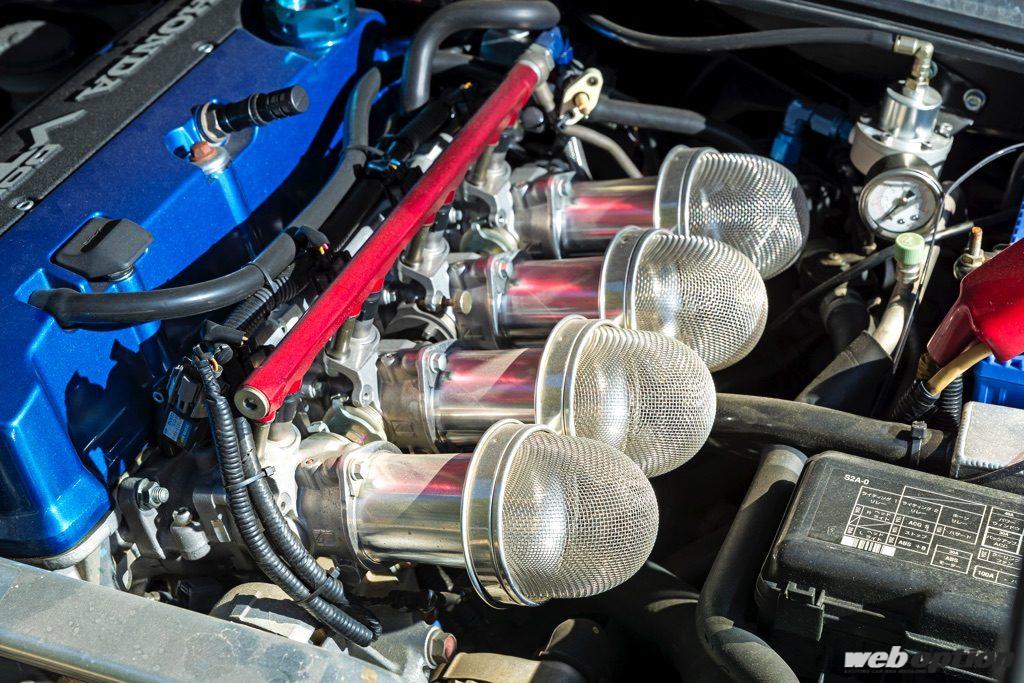 シャープなレスポンスが存分に体感できるスポーツインジェクションシステムもオリジナルを開発。制御は専用のフルコンで行われ、イモビライザーやエアコンなど実用面への影響も皆無。撮影車両はネット付きのファンネル仕様となっているが、異物の混入を防ぐための専用のインテークボックスも設定(別売)されている。