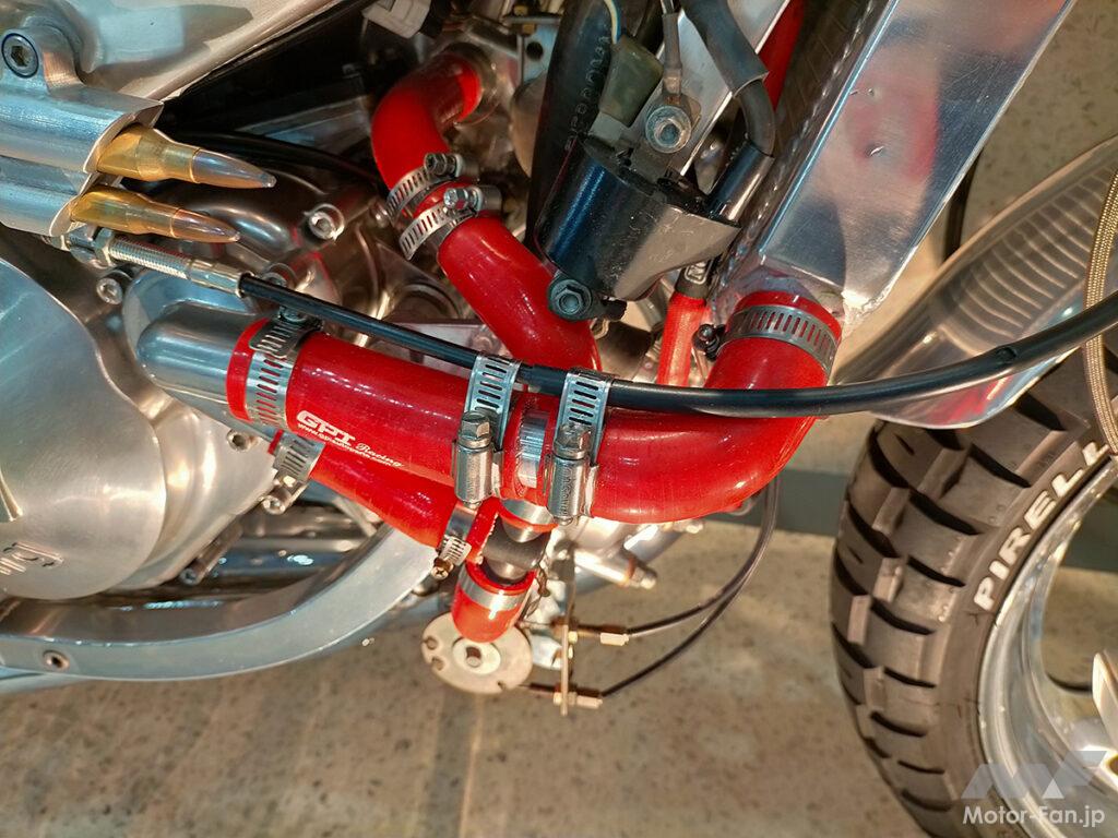 ロケットカウにはレッドのストライプを施し、ラジエターホースはレッドカラーにアレンジ。トータルバランスに優れ、随所にカスタマーのセンスが光る、注目度の高い一台に仕上げられている。