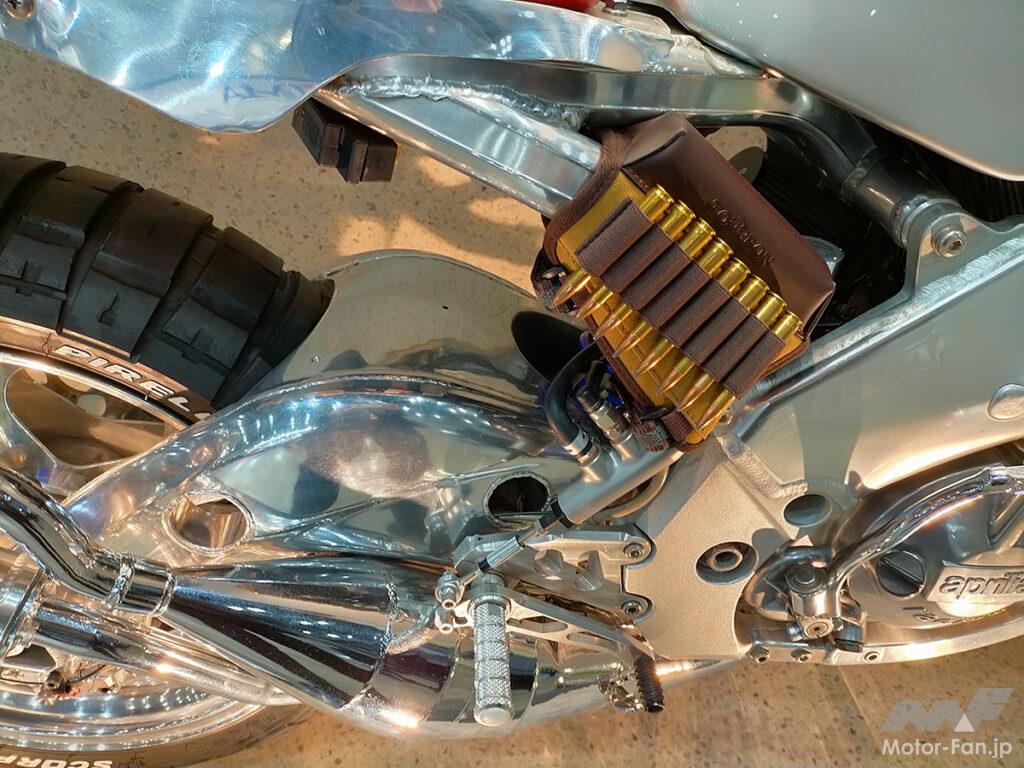 チャンバーは本体にメッキを施した、高性能なジGIANNELLI製を採用(サイレンサーはアルミ製でバフ掛け加工)。スイングアームはノーマルをベースに、後方に向けてスタビライザーを固定し、ナンバープレートをセット。
