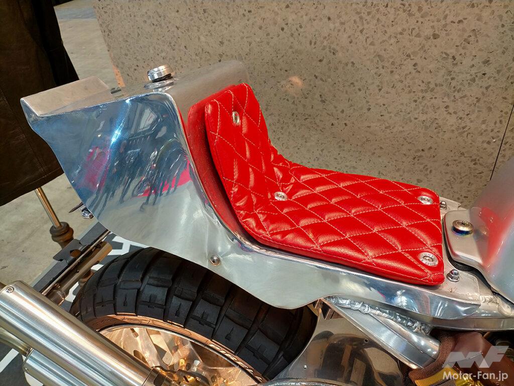 ノーマルとは一線を画す、レトロなフォルムのアルミ製ロケットカルは、かつての製作手法と同様、叩き出しによるワンオフ。アルミ製のワンオフシートカウルは丸みを帯びたノーマルとは異なり、やや角張ったフォルムにデザイン。これにレッドカラーのステッチ入りシートを上手に組み合わせ。