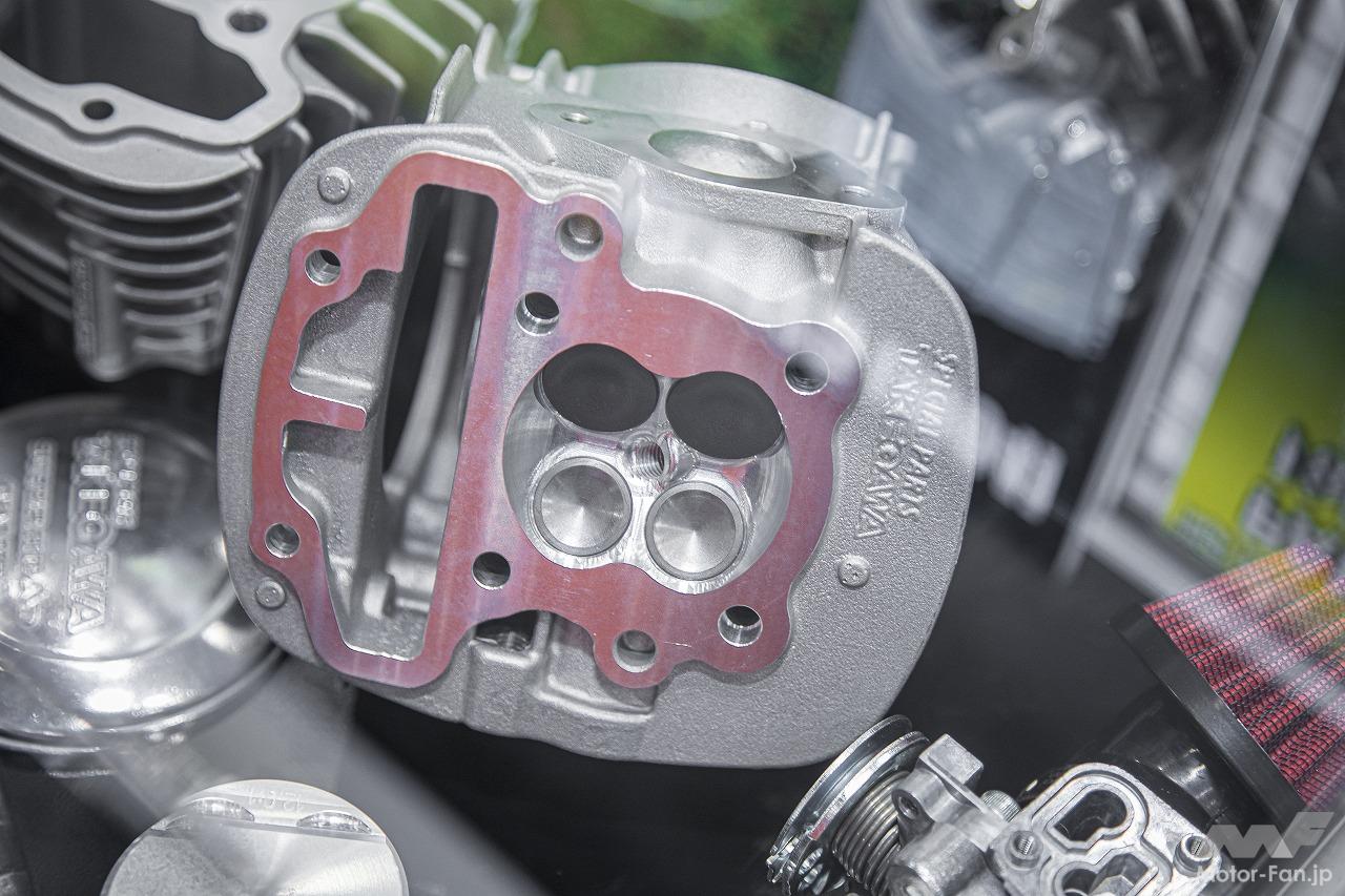 まず製品名からもわかる通り4バルブ仕様だ。バルブカーテンの面積を広げ、吸排気効率を高めつつ、さらに燃焼を均等にするセンタープラグ化も実現。肝心のバルブ径だが、吸気側(IN側)が21.5mm×2、排気側(EX側)が18.5mm×2に設定されているとのこと。もちろん従来通り、不等ピッチスプリング及びローラーロッカーアームなどで中高回転域での出力を維持し、バルブサージングを防止する。バルブステムシャフト径は4.0㎜サイズで、バルブの挟み角などもSP武川のノウハウを駆使しながら現行145㏄キット向けにマッチングさせている。