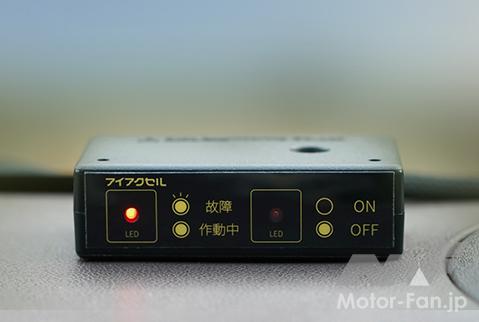 また、運転席のダッシュボードなどに装着できる「アイアクセル状態表示機」は、アイアクセルが作動する手前(フルスロットルに当たる)で警報ブザーを鳴らす機能を備えているため、ドライバーは「これ以上アクセルを踏んだらアイアクセルが作動する」ということが事前にわかり、運転者への加速の抑制を促す。