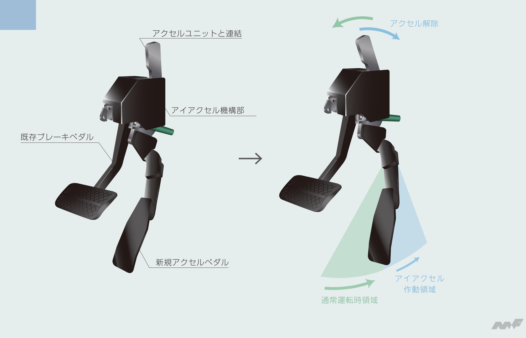 「アイアクセル」は、そのような社会問題となっているブレーキとアクセルの踏み間違い事故を防ぐ装置で、電子制御式、ケーブル式どちらのアクセルにも対応していて後付けでの取付けが可能だ。装置は機械式の為、雨などの天候や周辺環境に左右されない信頼性をもっている。しかもワンタッチで装置のON/OFFを切り替えることができる。