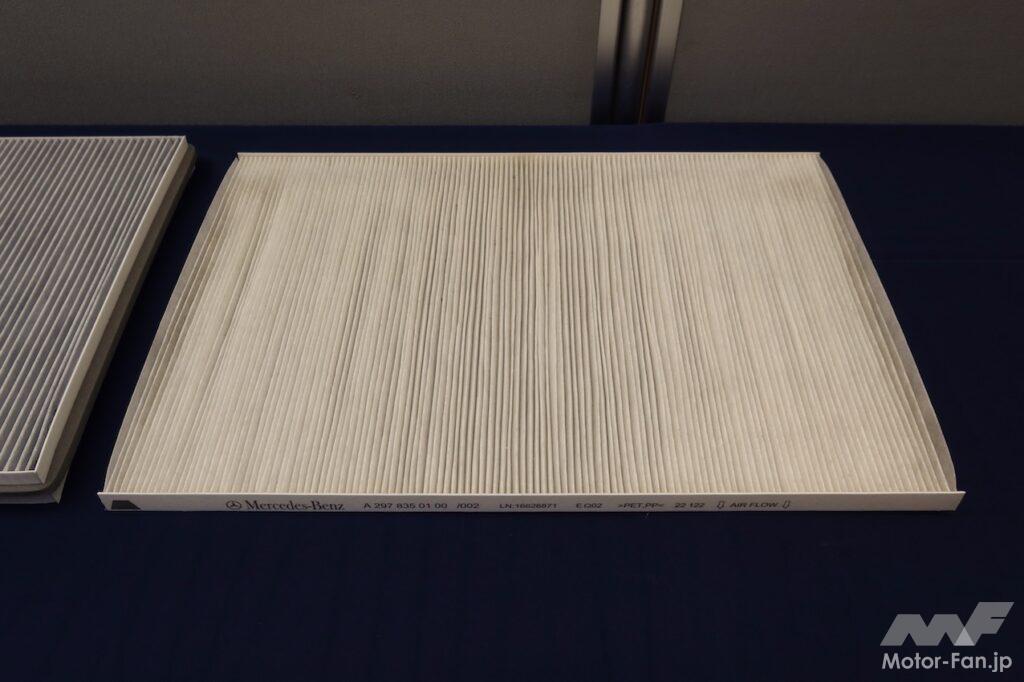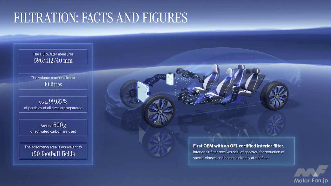フィルターのサイズは596×412×40mmでA2用紙とほぼ同じ。A4用紙約4枚分だ。約600gの活性炭の使用と室内側のフィルターにより、不快な臭いを低減。微細粉塵フィルターの吸着面積はサッカー場約150面に相当し、PM2.5~PM0.3クラスの微粒子を含め、粒子状物質を最大99.65%以上除去する能力を有するという。また、ウイルスの捕集機能も持ち合わせている。EQSは車内外の空気の状況をモニターしており、状況に応じて外気導入/車内循環を自動で切り換える。室内の空気の汚れ具合は、MBUXハイパースクリーンのセンターディスプレイで確認することが可能だ。