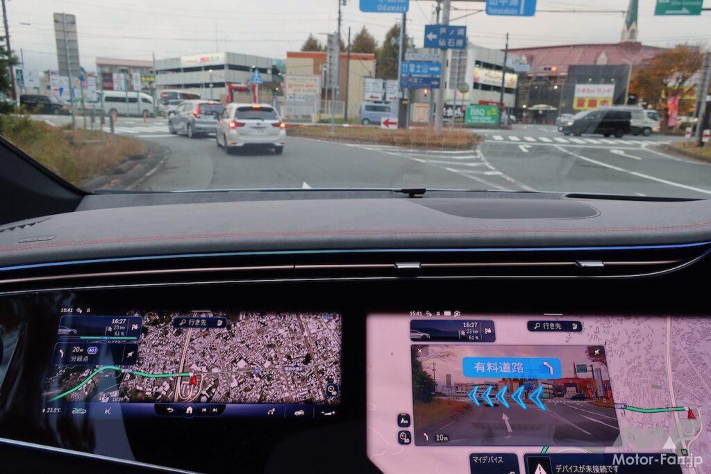 MBUXハイパースクリーンに表示される高精細な3Dマップはもはや、情報表示の枠を超えてエンターテインメントだ。助手席に座って地図を眺める行為が単純に楽しい。目的地を設定した際のドライブでは、ARナビゲーションが体験できる。ARナビゲーションは拡張現実(AR)技術を搭載したナビゲーションのことで、車載カメラで捉えた現実の映像上に、進む方向の矢印などを表示する。