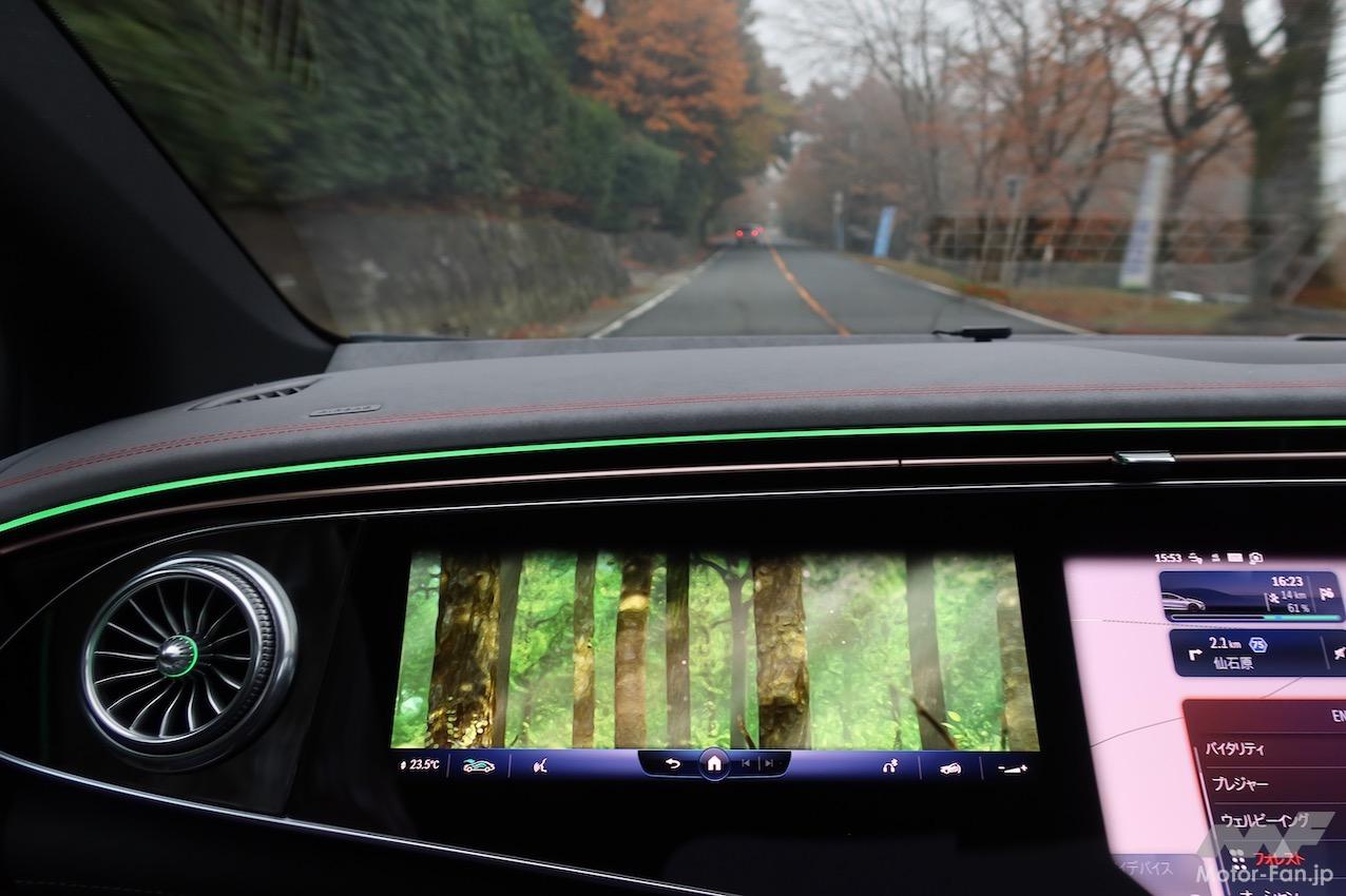 プログラムによって温かみのある照明に変えたり、涼しげな照明にしたり、リラクゼーション効果のある香りを漂わせたり、派手なサウンドを響かせたり、もみほぐし機能が働いたりと、五感を心地良く刺激してくれる。EQSで初搭載した機能ではないが、ARナビゲーションと同様、最新技術満載のEQSとの親和性が高いと感じた。まるで、ラグジュアリーホテルのリラクゼーション施設がクルマに組み込まれたかのよう。ドライバーだけでなく、助手席の乗員も存分に機能を味わえるのが魅力だ。