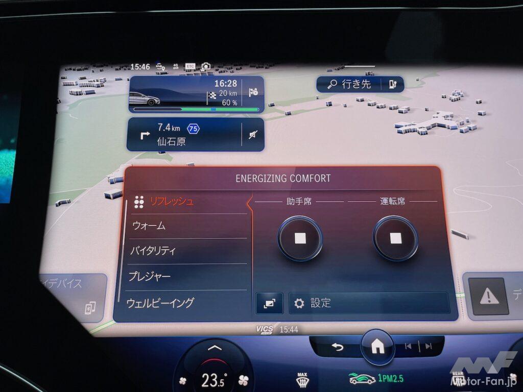 エナジャイジングコンフォートは車内温度、空気清浄、香り、音楽、照明などを切り換えることで、乗員の状態に合わせて最適な車内環境を提供する機能だ(Sクラスなどにも適用)。リフレッシュ、ウォーム、バイタリティ、プレジャー、ウェルビーイング、フォレスト、オーシャンなどのプログラムがあり、バイタリティではサウンドで気分を盛り立ててくれ、ウェルビーイングではシートヒーターと断続的な振動の組み合わせにより、くつろぎ効果を生み出す。