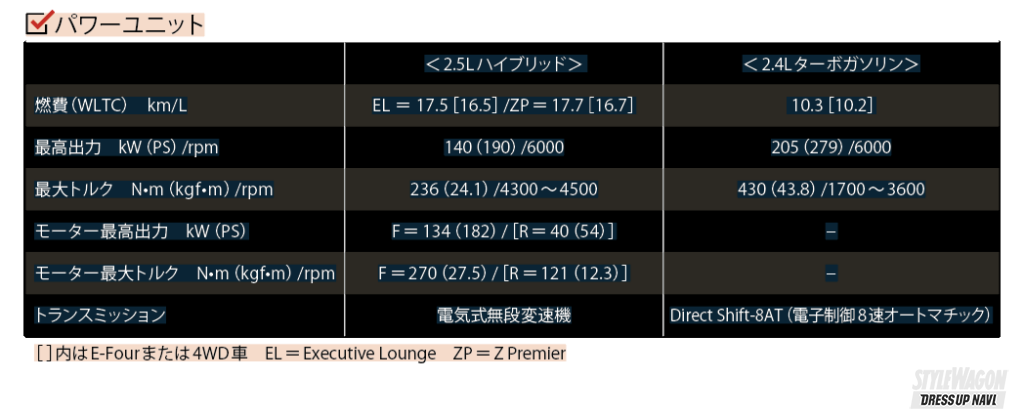 「Z Premier」の顔つきは、アルファードよりも精悍な印象で、リヤはトレンドの横一文字のテールランプが目を惹く。もちろん、贅の限りを尽くした「Executive Lounge」も控えている。両グレードともに19インチタイヤが標準で、足元からもアグレッシブなムードが漂ってくる。