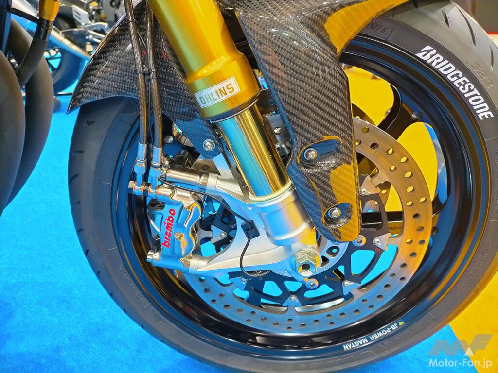 前後ホイールは世界初のマグネシウム鍛造という製法で生み出された超軽量で超高剛性を実現した「JB-POWER MAGTAN」を選択。前後タイヤはストリートユースからサーキット走行まで対応した、ハイグリップな「ブリヂストン バトラックス ハイパースポーツS23」。サイズはF120/70ZR、17R180/55ZR17をチョイス。