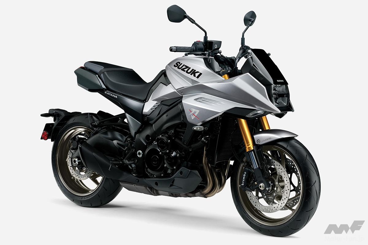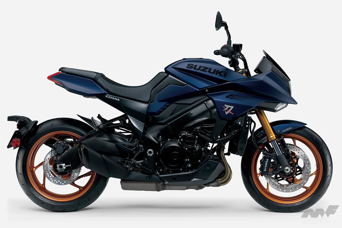 スズキ KATANA、各部の仕様変更で2馬力アップに!【EICMA 2021】2021年11月23日にイタリアで開幕したバイクの展示会、EICMA(ミラノショー)。このショーでスズキは、KATANAの2022年モデル(欧州仕様車)を初公開。ユーロ5排ガス規制に対応させたエンジンは、150馬力から152馬力にアップ。ボディカラーは渋みを効かせたメタリックマットステラブルーとソリッドアイアングレーの2色。 REPORT●北 秀昭(KITA Hideaki)
