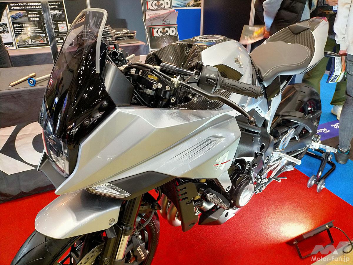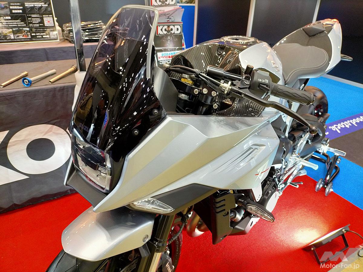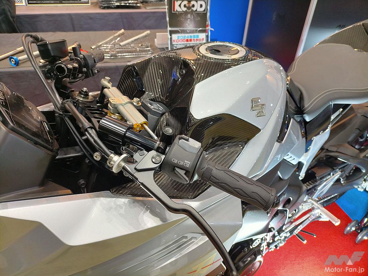 「ACRY-Point(アクリポイント)」のフロントスクリーン、ウッドストックの「トップブリッジAタイプ&セパレートハンドルキット(市販モデル)」、軽さと強度を追求したウッドストック製の「ドライカーボンタンクカバー(市販モデル)」を組み合わせ。