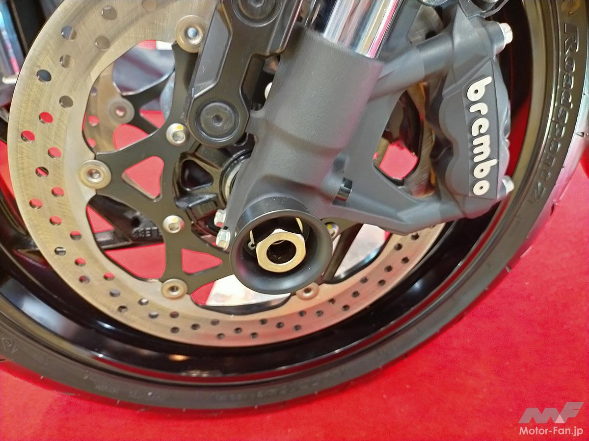 フロントスクリーンは「ACRY-Point(アクリポイント)」のロングタイプとし、ウッドストックの「トップブリッジAタイプ&セパレートハンドルキット(市販モデル) ※注1」でフロント周りのイメージを変更。 ※注1:ウッドストック製ドライカーボンタンクカバー専用品。純正タンクには使用不可