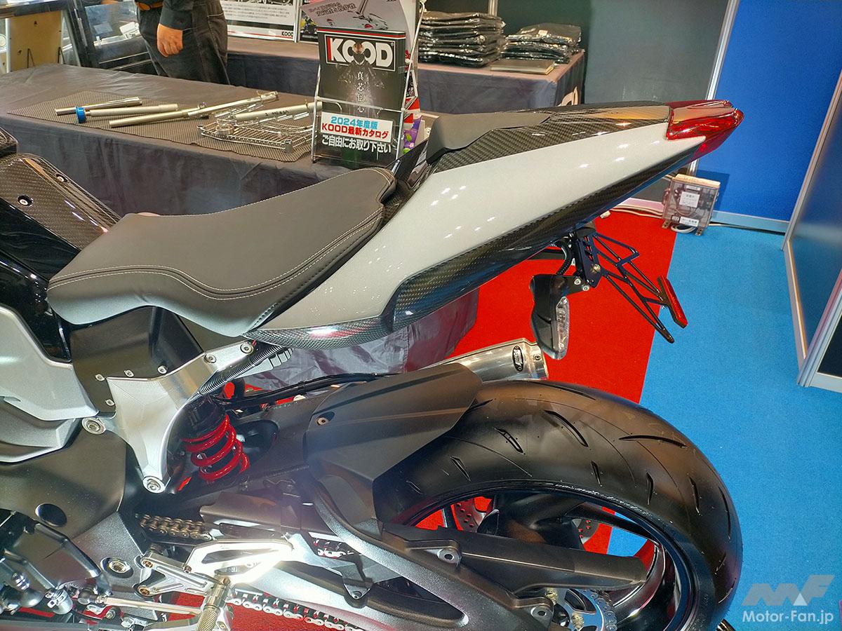 シートレールやジョイント部はアルミ削り出しでワンオフ製作。シングルシートと一体型のテールカウルは、後方まで伸びたシャープなイメージのロングタイプ(ワンオフ)に変更。