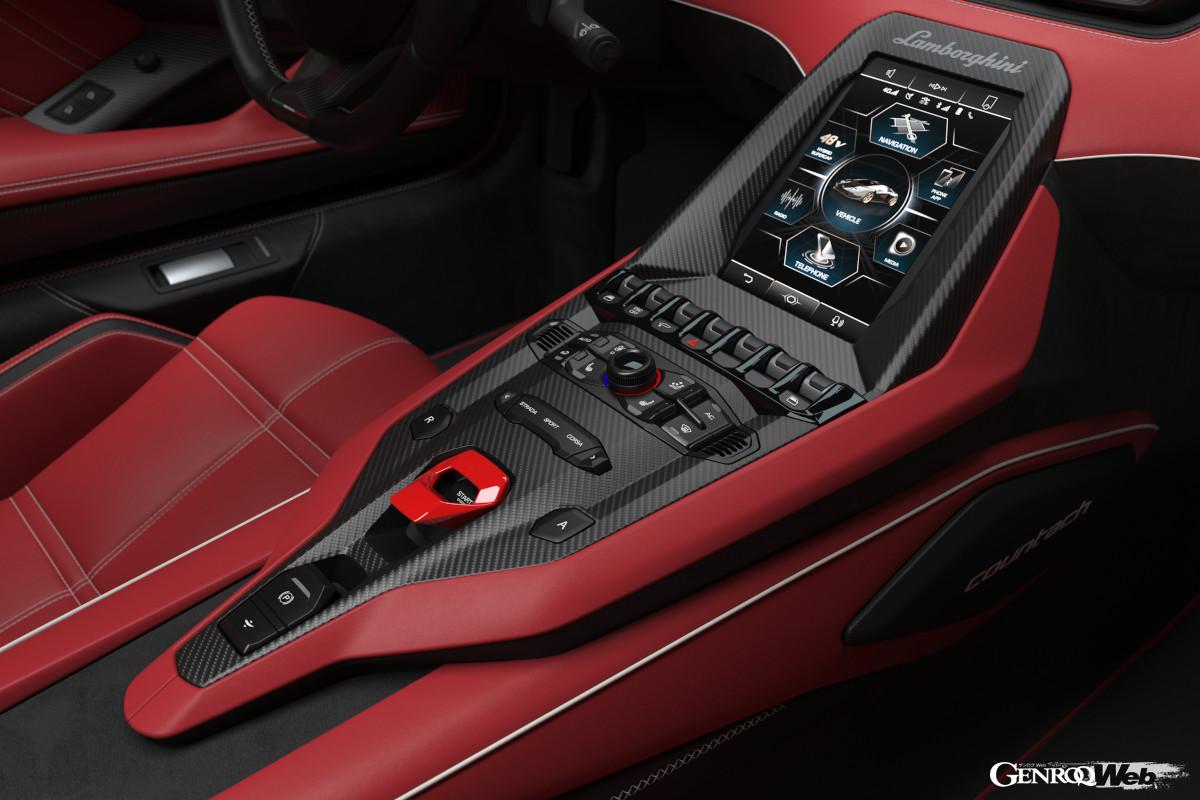 カウンタックLPI800-4に搭載されるパワーユニットは、最高出力で780PS、最大トルクでは720Nmを誇る6.5リッターV型12気筒自然吸気。これに48Vのエレクトリックモーターを備えるマイルドハイブリッド機構を備えることがIの意味となる。