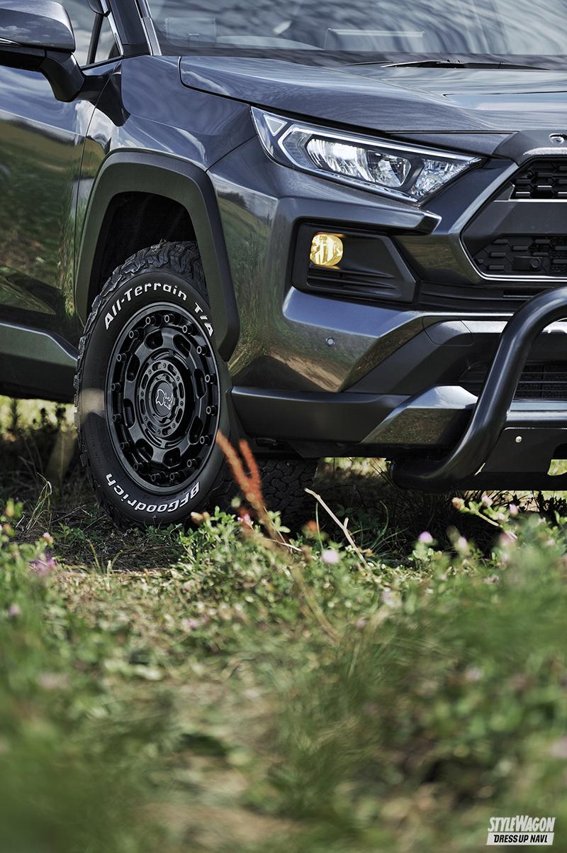 サイズはRAV4に履きやすい17インチ8J設定。装着するマットブラックに加えて、武骨さを主張するオリーブドラブグリーン/ブラックリップも用意した。最新のMIL–OFFスタイルを一気に打ち出すことができる最新作となっている。