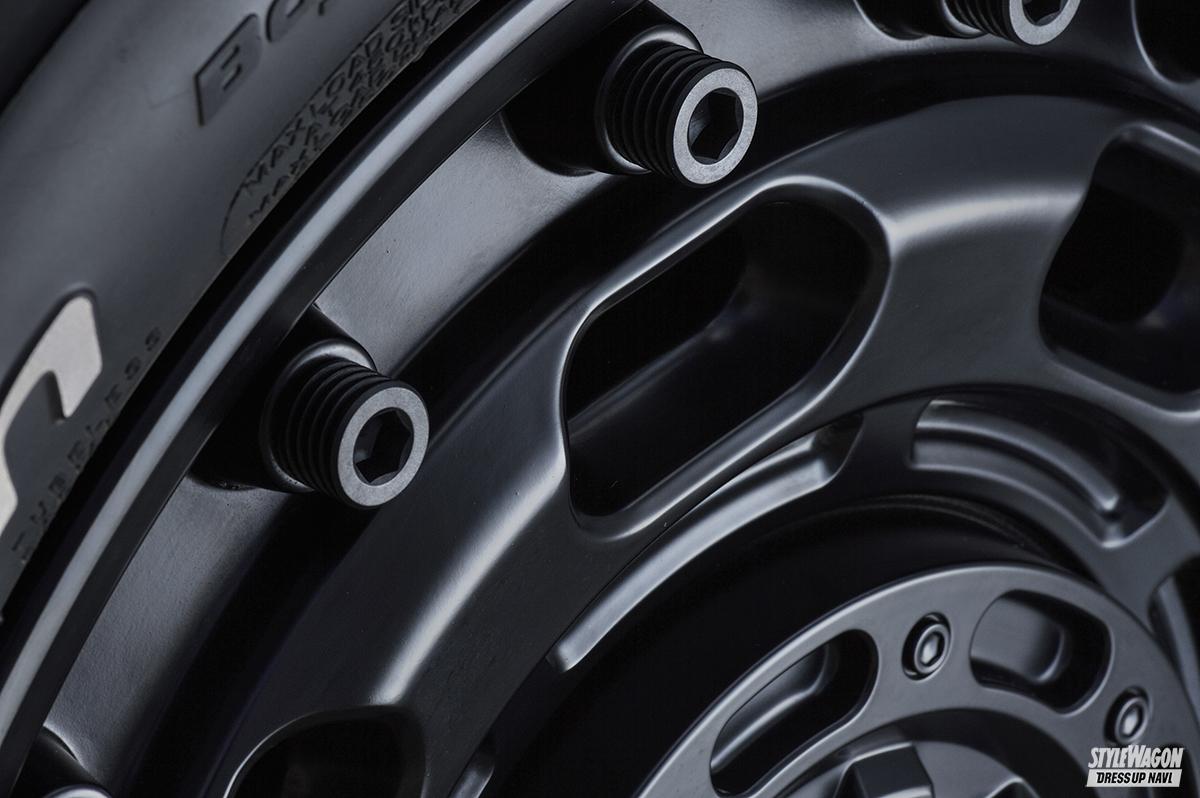 本意気かつ本場ならではの先進的意匠がポイント。アグレッシブ&ワイルドなオフスタイルを端的に打ち出すことが可能だ。NEWモデルとなるアトラスは、超武骨なビッグボルトを外周部にレイアウトしたディッシュ仕様。その内側に8孔とくぼみを設けた無機質かつ立体的な造形が特徴だ。その印象はまるでタフネスと実用性に特化した軍用車両のホイールのよう。昨今の4×4カスタムシーンでは、こんなミリタリー仕様がトレンドの兆しを見せる。これをUSならではのテイストで楽しめる1本なのだ。