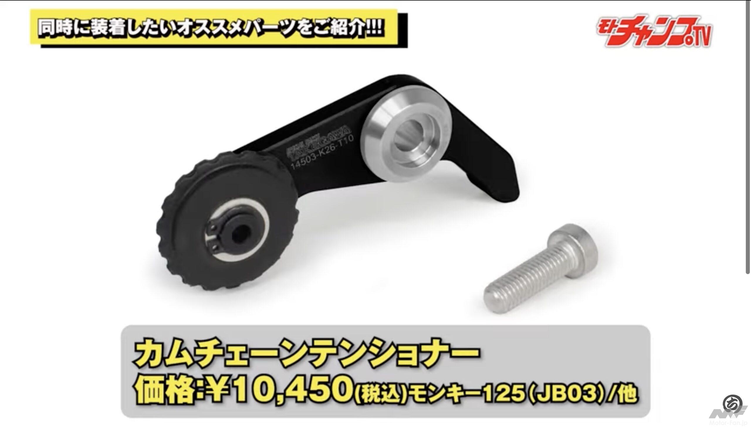 エンジンの保護という意味ではクランクシャフトの動きを抑制するサポートアダプターもオススメ。特に高回転を多用する乗り方をするなら、是非とも組み込みたいパーツだ。さらに噛むチェーンテンショナーも強化型にすることでチェーンの弛むを予防することができる。