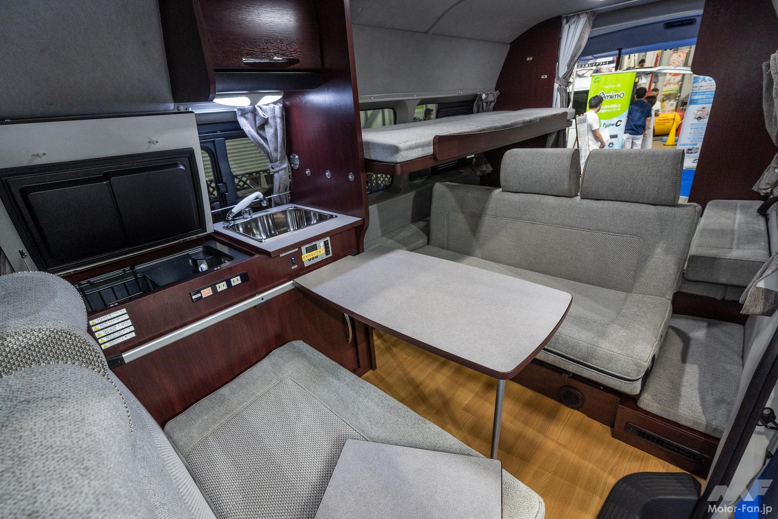 さてワイドボディになると、車内装備は豪華。まず、キッチン&シンクはスライドドアを開けた所に配置しているのがほとんど。これは室内幅に余裕があるためで、シートの居住性が窮屈にならないからだ。もちろん、後部にレイアウトされる空間もあるが、いずれもキッチン後ろの空間にゆとりがあるため、標準ボディに比べると調理がしやすい。