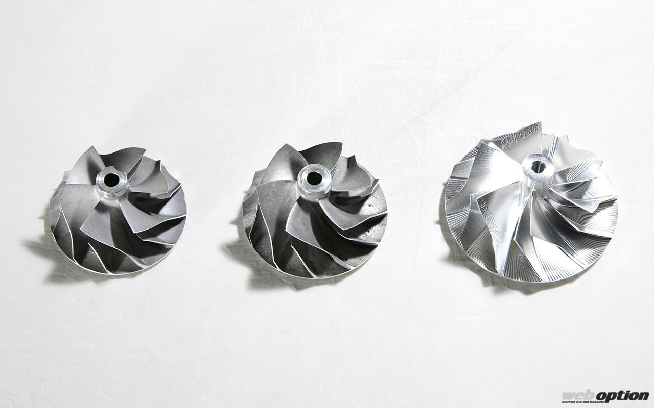 コンプレッサーブレードの比較。左から標準車ノーマル、トップシークレットBB700、同BB900となり、大きさの違いは一目瞭然。