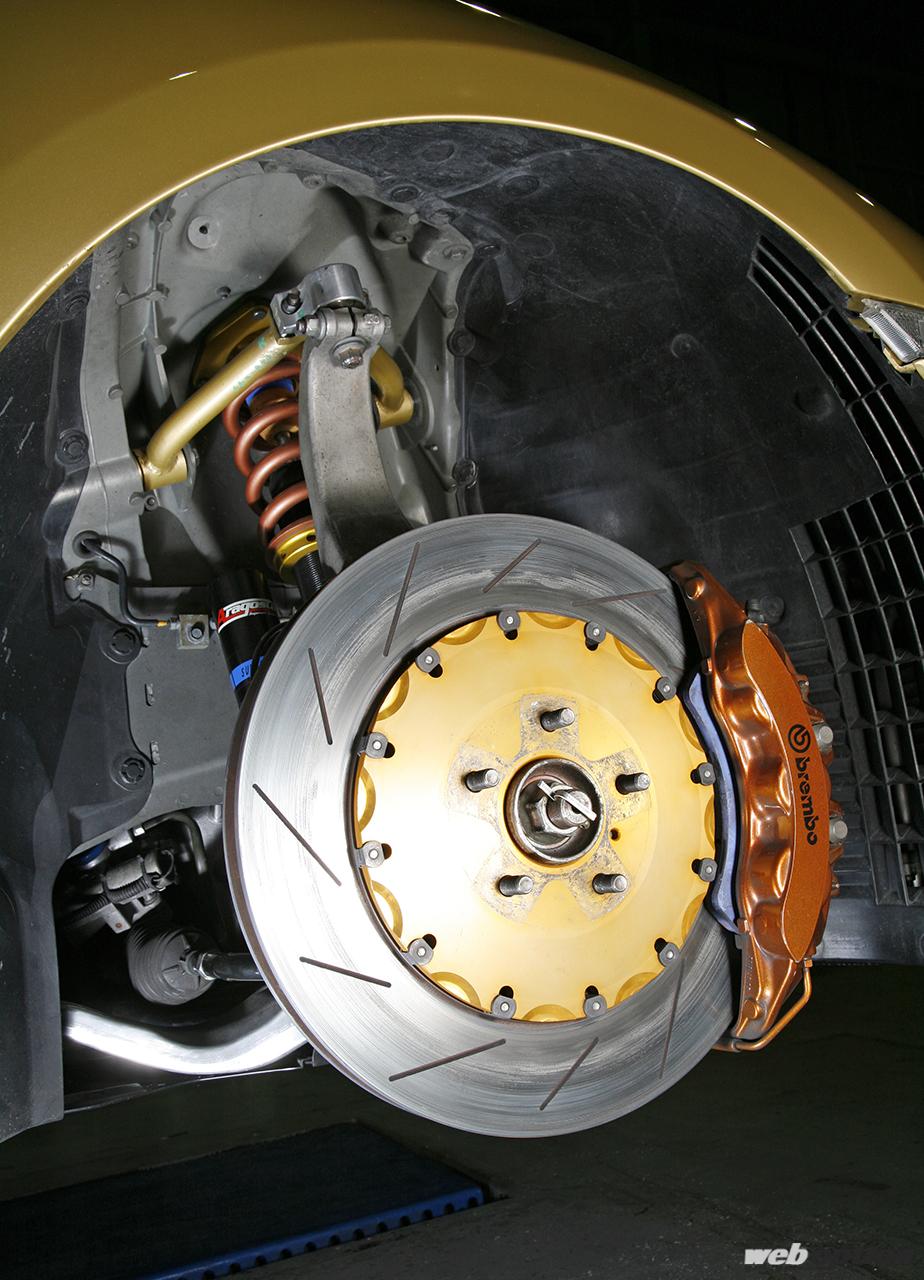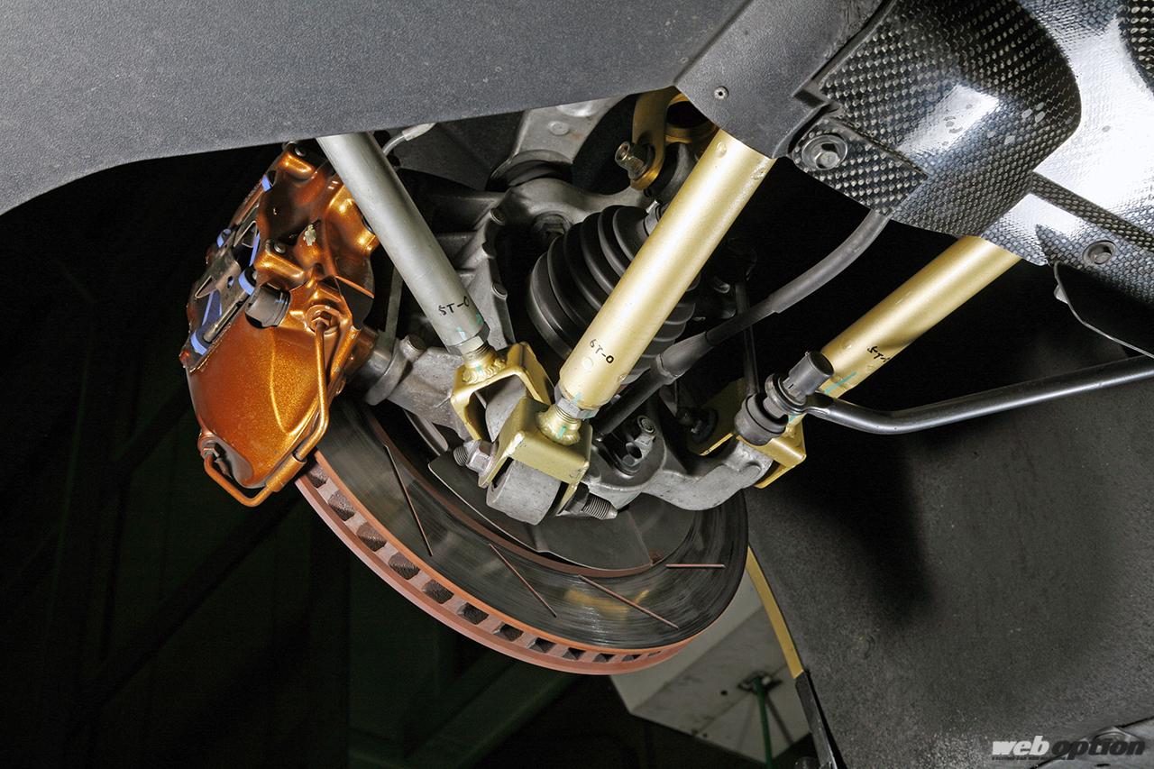 アッパーアームはオリジナル調整式で、ネガティブキャンバー角を最大4.5度までつけることが可能。また、ブレーキはオリジナル400mmオフセットローターキットで制動性能を高めている。