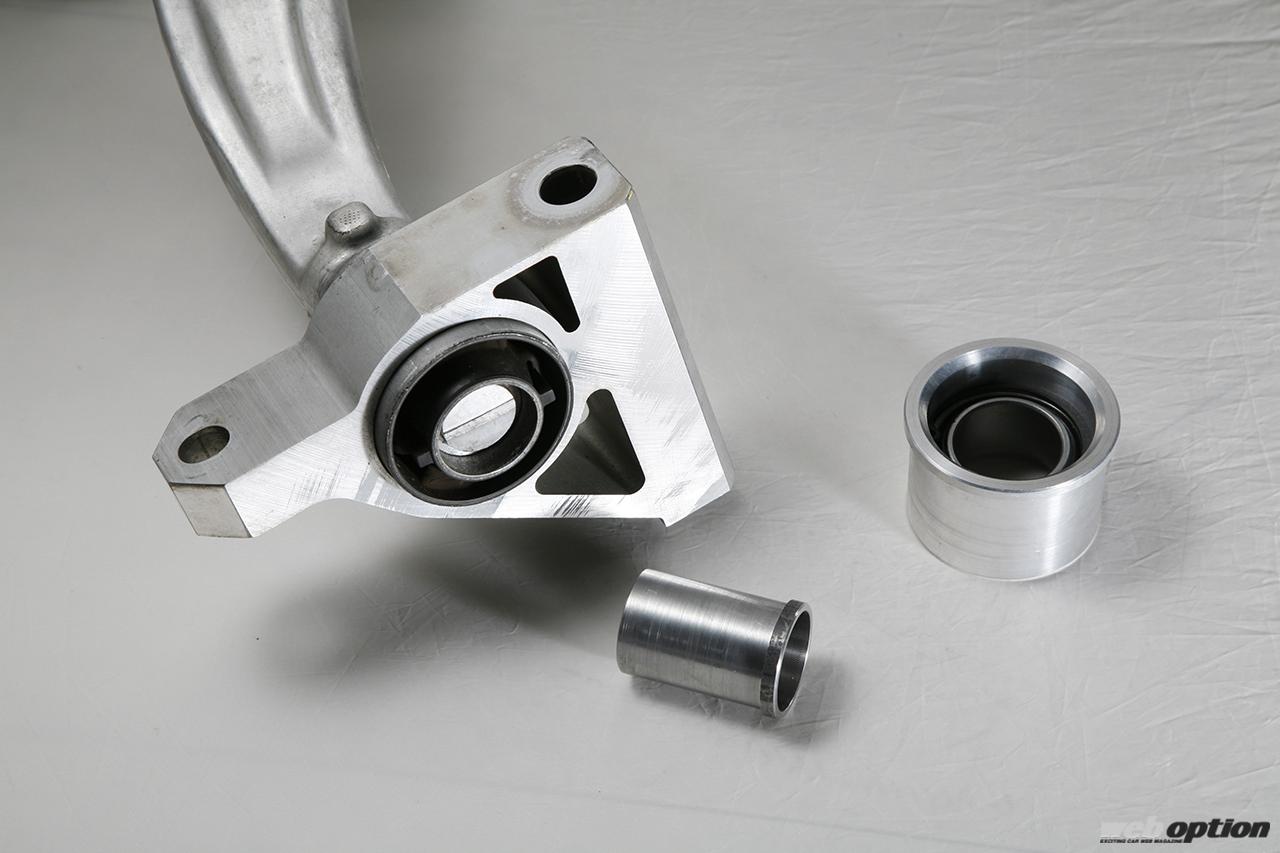 フロントロワアームの前後ブッシュはトップシークレットオリジナル、スーパーピロブッシュに交換。これで加速時にトーアウト方向、減速時にトーイン方向に動いてしまうフロントタイヤのアライメントを適正化することができる。