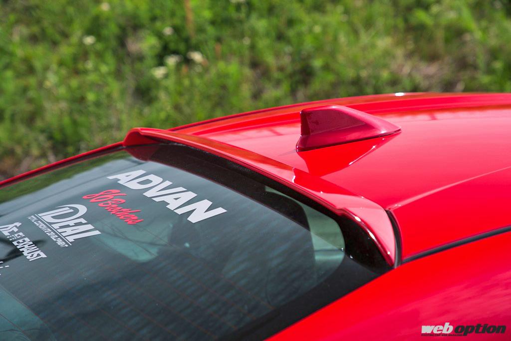 ルーフ後端に取り付けられるルーフスポイラー(5万5000円)はコンパクトなデザインながらも、視覚的なアクセントとして効果的なアイテム。ルーフに流れる空気を整流するといった機能性に着目するのではなく、あくまでもカッコ良いことが重要。