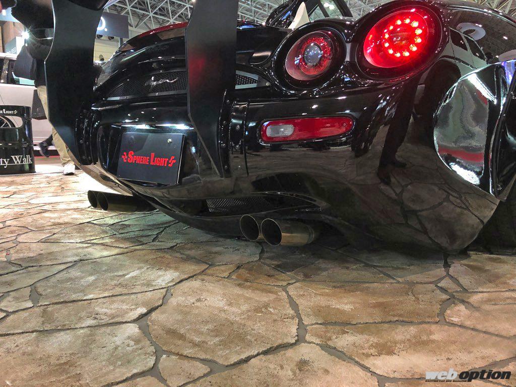 リヤフォルムのアプローチも見逃せない。ナンバー横からステーを立ち上げたバーチカルGTウイング(LBウイング)に4本出しのワンオフマフラーを装備。まさに「カッコ良い」を極限まで追求したスタイリングアプローチだ。