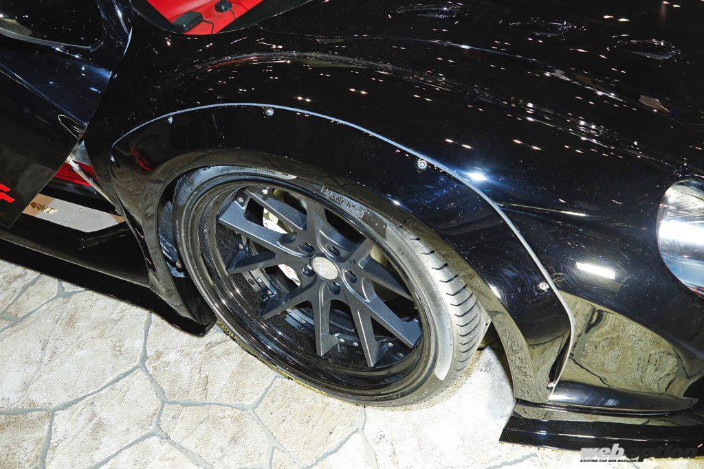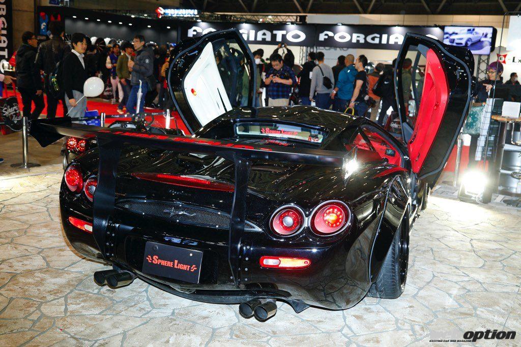 この光岡オロチは、HIDやライティングパーツの専門メーカー“スフィアライト”のデモカーなのだが、さらなる進化を狙って世界的に有名なカスタムビルダー“リバティーウォーク”と強力タッグを結成。リバティー得意のワークスフェンダーをインストールし、超ド級のロー&ワイド仕様へとバージョンアップが実行されたのだ。