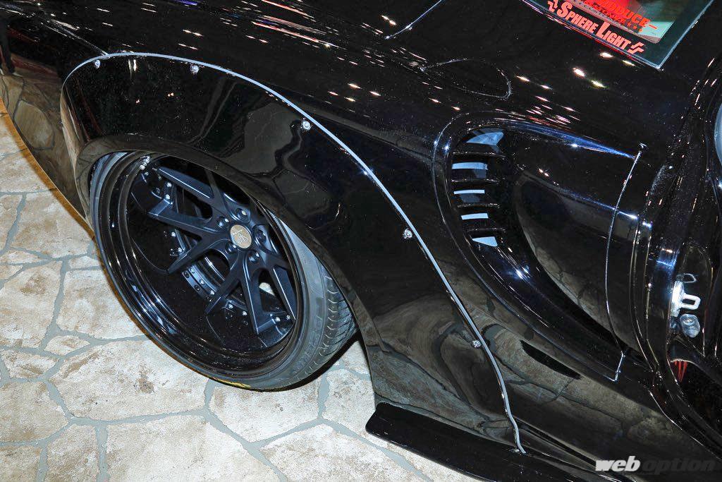 フロントセクションはアンダーパネルを追加するのみだが、エアフォースのエアサスキットで極限までローダウンされているため、その印象は“地を這う大蛇”である。なお、ヘッドライトは全てスフィアライトの自社製品でバージョンアップ済みだ。