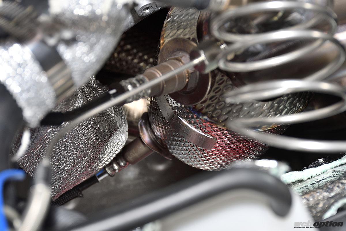開発に当たって苦心しているのは、いかにパワーを抑えるかという部分。というのも、ブースト圧を絞った状態でも触媒レスだとパワーは400psを超え、純正触媒装着では330psとなる。そこで、燃料系ノーマルで350psを獲得すべく、現在はターボマニに組み込むメタル触媒のテストを重ねているところだ。