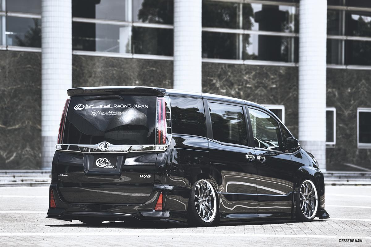 姉妹車、ヴォクシーと同じハーフエアロを提案するのは、ご存じクールレーシング。オリジナルエアロやホイールを筆頭に、全国各地で展開しているサテライトショップの運営、そこでのコンプリート販売にもチカラを注ぐ、いまもっとも勢いのあるブランドの1つだ。