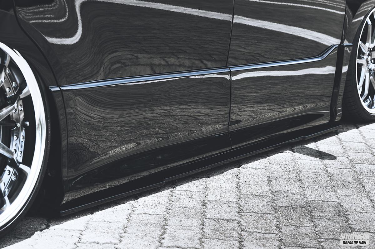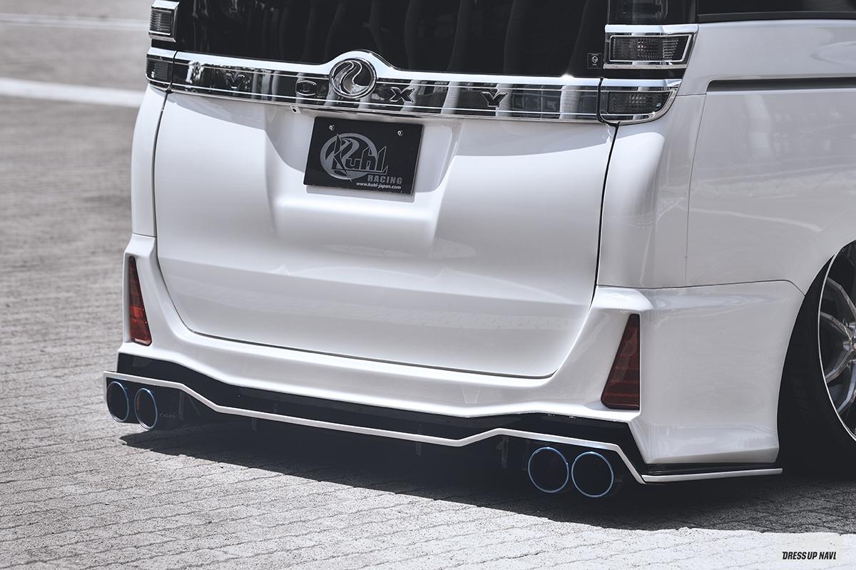 そんなクールレーシングのノアも全2タイプ。1つはブラックボディのノアがまとうスタイル「80N-SS」スタイル。シンプルに徹したクール入門にも最適な選択肢で、リアがディフューザーと称すフラップのみで構成される。一方「80N-GT」は、リアが大きく異なる。まずバンパーがオリジナルの交換型となり、そのエアロ専用でディフューザーを用意。後者はさらに4本出しマフラーも組み合わせ可能という、風格抜群のアグレッシブ系となっている。