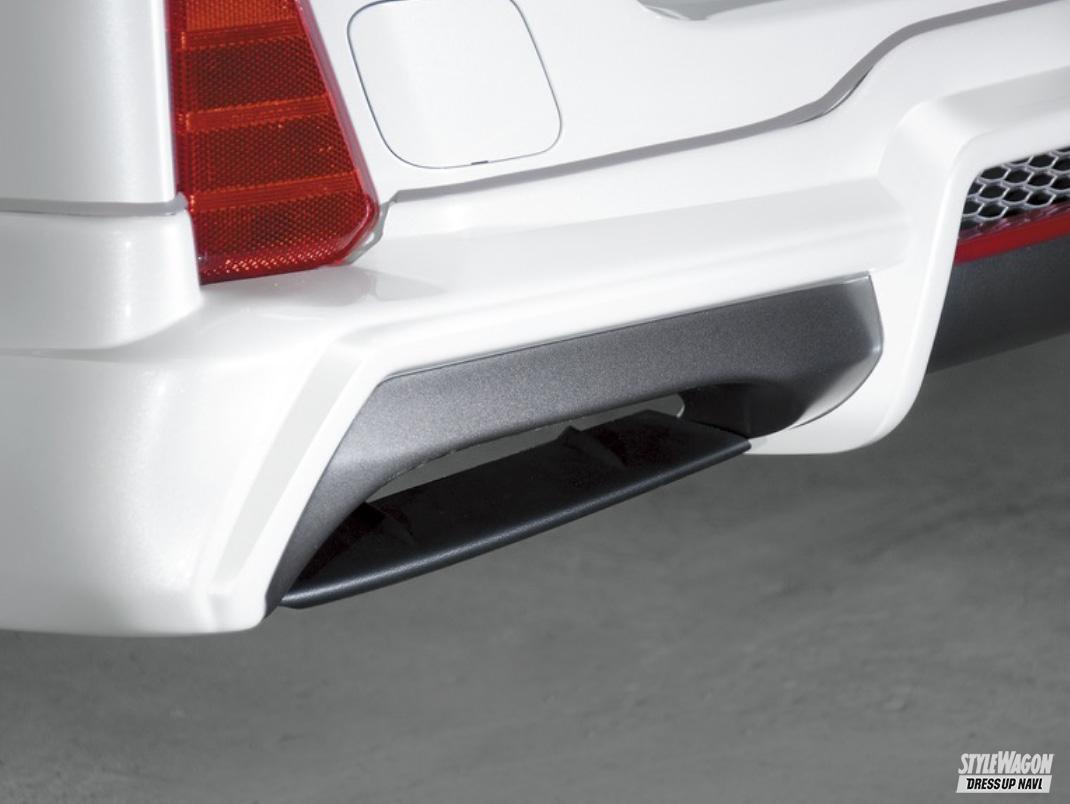 純正ボディの物足りなさを解消する手堅いエアロで、ボディボトムに安定感とワイド感、そして疾走感を演出するニューズデザインのハーフ。スタイリングの印象を決定づけるフロントは中央を純正ラインに沿って立ち上げたブリッジ形状とし、そこにフィンを設けダクト化。サイドはドアパネル的要素を加えつつ、実用性に配慮した前後分割式となる。リアは左右中央のスリーブロックタイプ。別売りのマフラーをマッチングできるほか、純正マフラーでも違和感がないよう、(マフラーのない逆側の)開口部を囲める専用フィンを用意するなど、まとまり良くアレンジできる。
