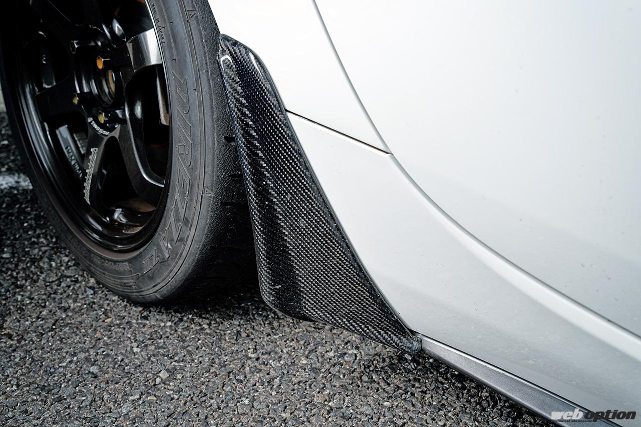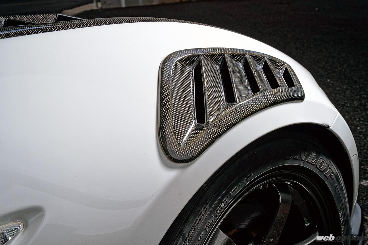 フェンダー内の圧力や熱を抜くことで、走行抵抗の軽減とブレーキの冷却性を高めるフェンダールーバーも装着。こちらも他のパーツと同様に、元々はレーシングカーへのインストールを目的に開発されたものだ。