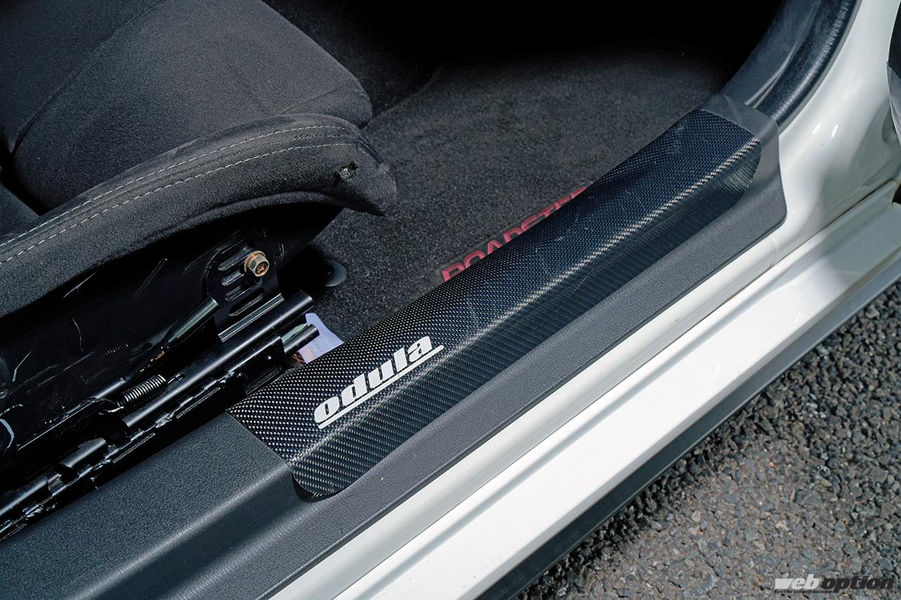 傷が付きやすいドアシル部分をカバーするカーボンスカッフシートも開発。左右セットでブラックカーボン、シルバーカーボン、レッドカーボンがラインナップされる。