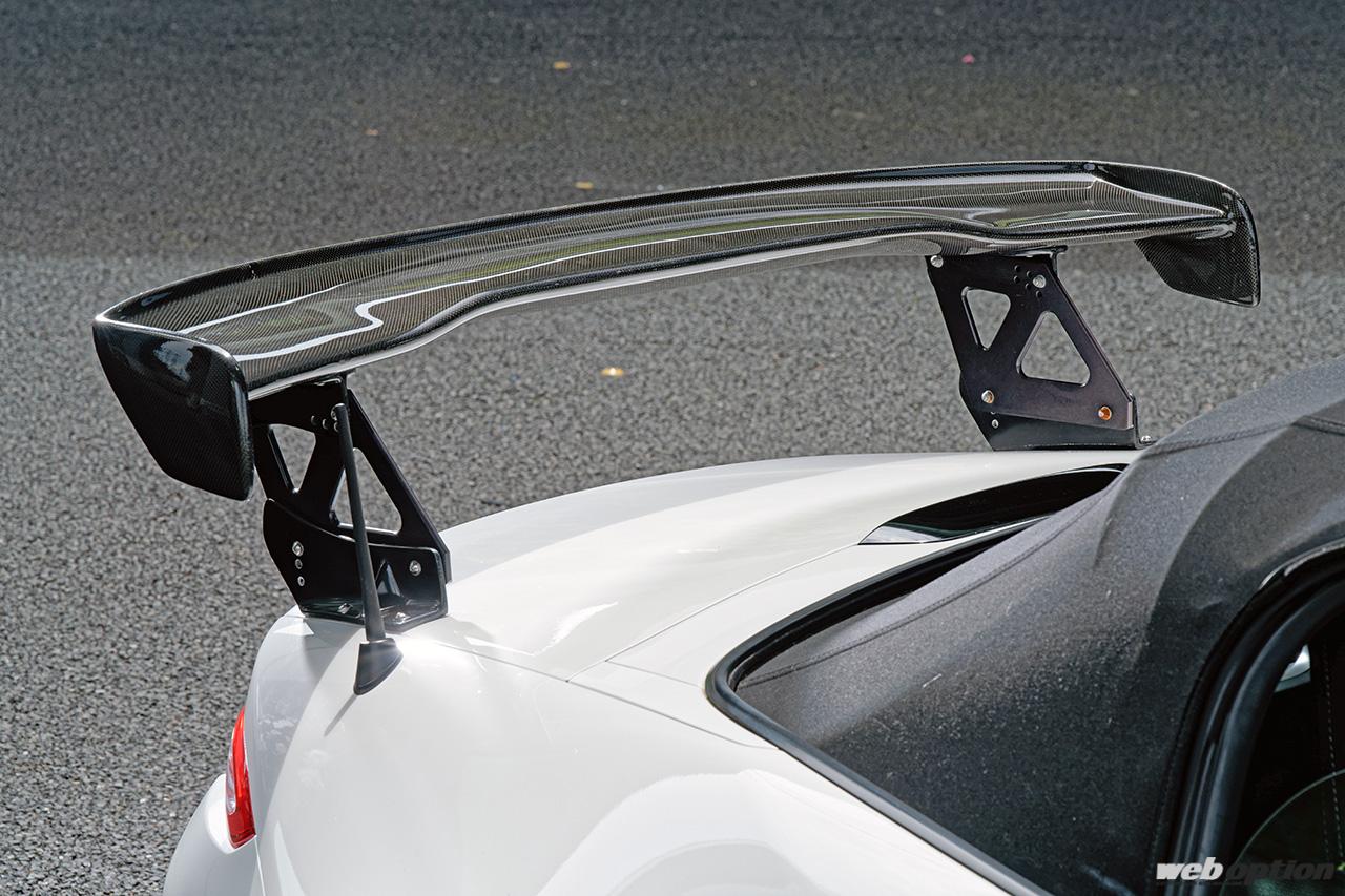 GTウイングは、スーパー耐久仕様と基本的に同じデザインではあるものの、ストリートで問題なく使用できるよう全幅を1380mmにアレンジ。RFに装着してもルーフ開閉には干渉しない作りとなっている。