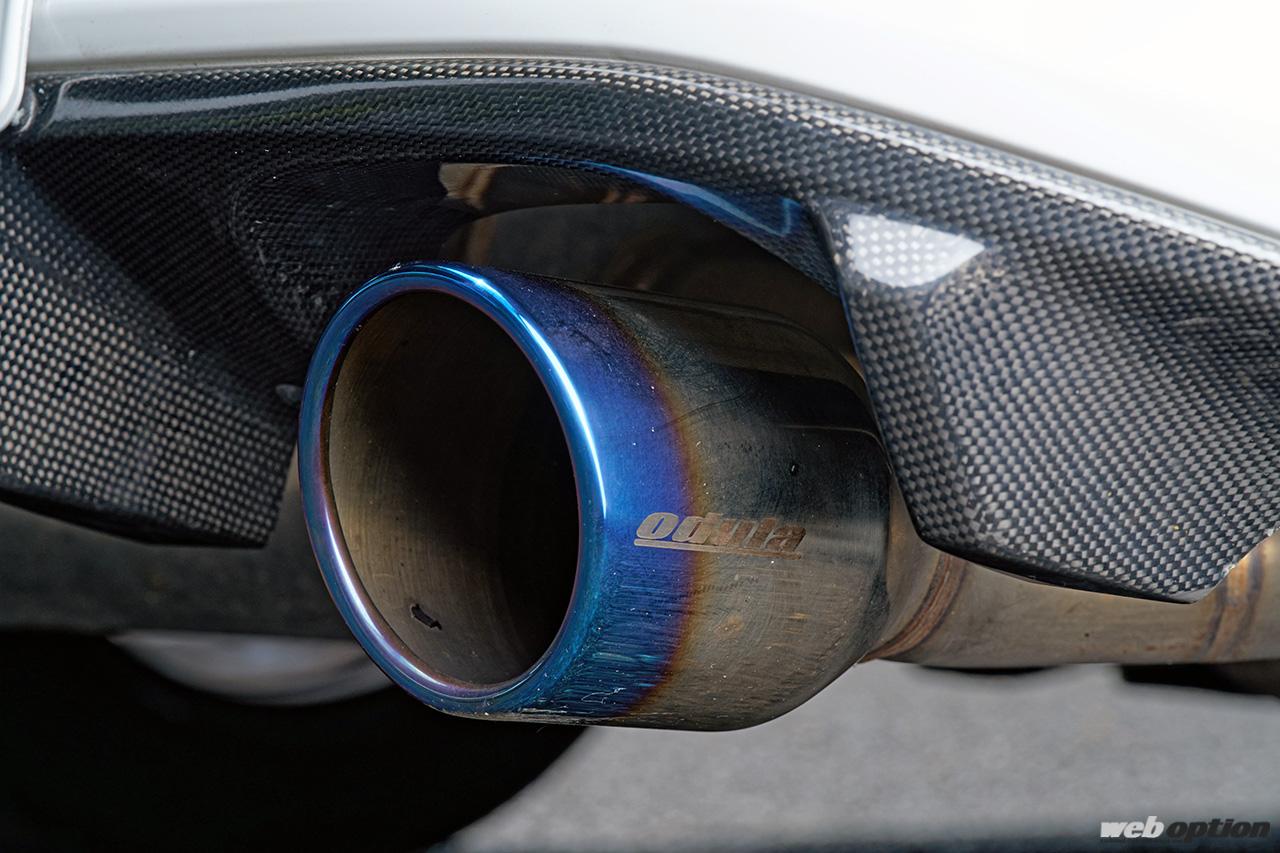 排気効率はもちろん、重量面にも配慮したRスペックマフラーはリヤディフューザーとのマッチングでスポーティなリヤビューを演出する。